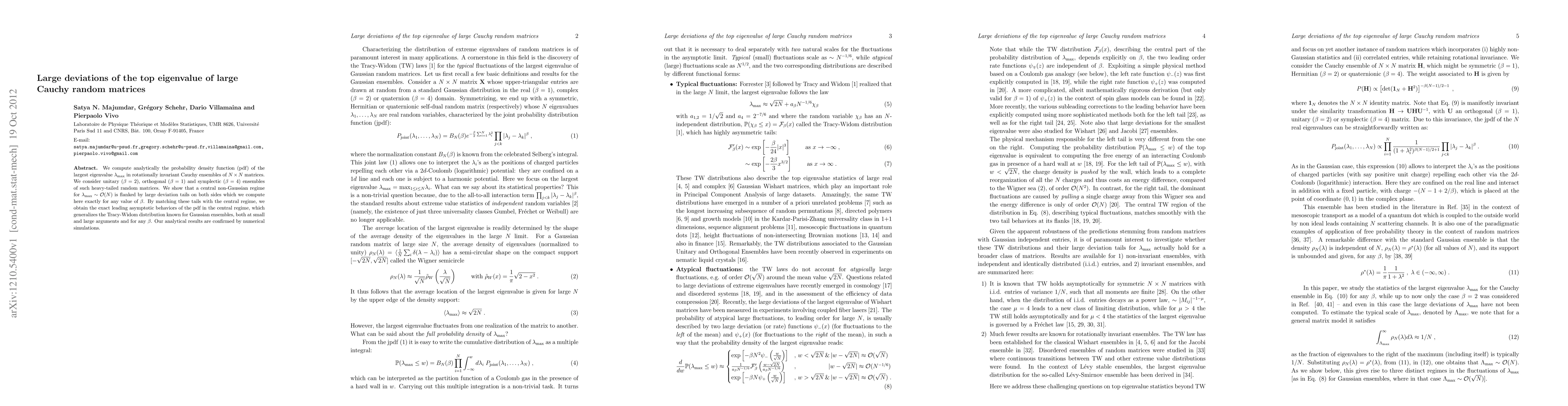 This paper analytically computes the probability density function of the largest eigenvalue in large Cauchy random matrices, revealing exact large deviation tails for different $\beta$ values and deriving the leading asymptotic behaviors that generalize the Tracy-Widom distribution. Numerical simulations confirm the analytical results.