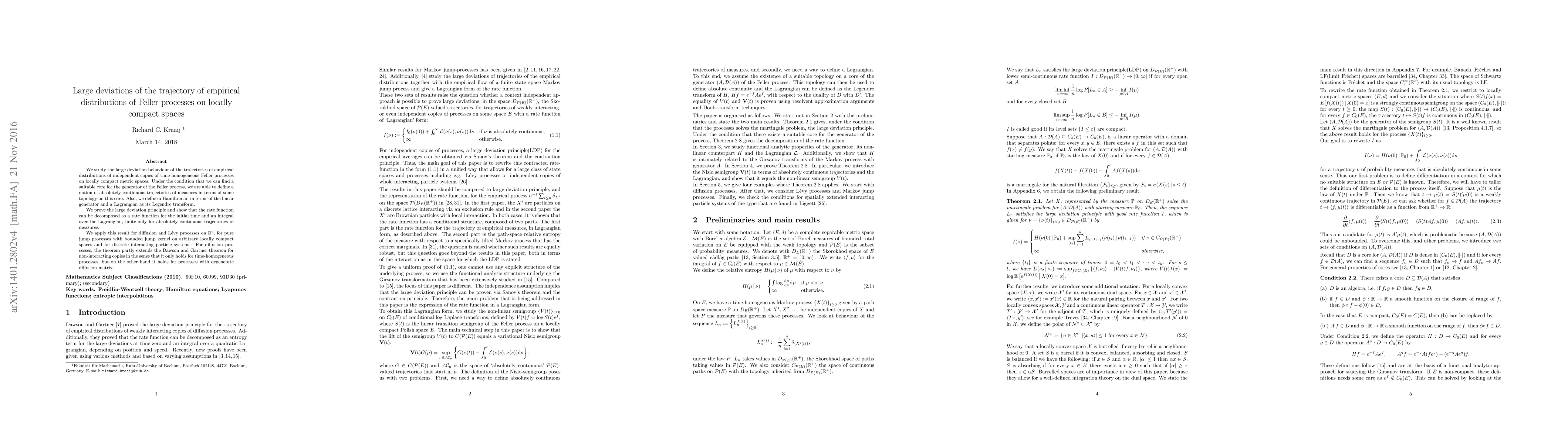 We study the large deviation behaviour of the trajectories of empirical distributions of independent copies of time-homogeneous Feller processes on locally compact metric spaces. Under the condition that we can find a suitable core for the generator of the Feller process, we are able to define a notion of absolutely continuous trajectories of measures in terms of some topology on this core. Also, we define a Hamiltonian in terms of the linear generator and a Lagrangian as its Legendre transform. We prove the large deviation principle and show that the rate function can be decomposed as a rate function for the initial time and an integral over the Lagrangian, finite only for absolutely continuous trajectories of measures. We apply this result for diffusion and L\'evy processes on R^d, for pure jump processes with bounded jump kernel on arbitrary locally compact spaces and for discrete interacting particle systems. For diffusion processes, the theorem partly extends the Dawson and G\"artner theorem for non-interacting copies in the sense that it only holds for time-homogeneous processes, but on the other hand it holds for processes with degenerate diffusion matrix.
