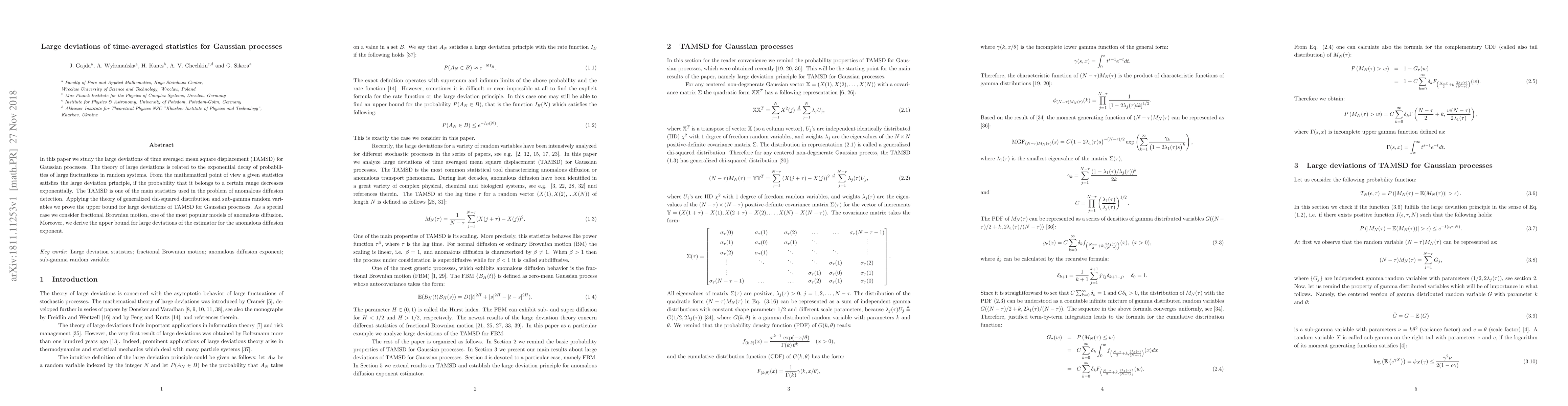 The paper applies the theory of large deviations, specifically focusing on the generalized chi-squared distribution and sub-gamma random variables, to analyze time-averaged mean square displacement (TAMSD) for Gaussian processes, including fractional Brownian motion as a special case.