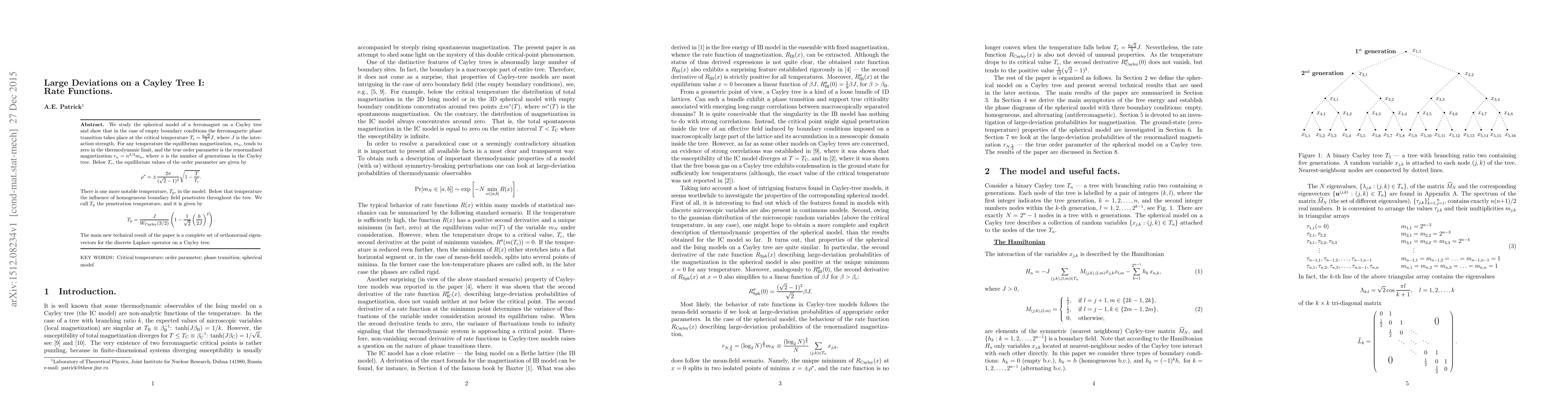 We study the spherical model of a ferromagnet on a Cayley tree and show that in the case of empty boundary conditions the ferromagnetic phase transition takes place at the critical temperature $T_c=\frac{6\sqrt{2}}{5}J$, where $J$ is the interaction strength. For any temperature the equilibrium magnetization, $m_n$, tends to zero in the thermodynamic limit, and the true order parameter is the renormalized magnetization $r_n=n^{3/2}m_n$, where $n$ is the number of generations in the Cayley tree. Below $T_c$, the equilibrium values of the order parameter are given by \[ \rho^* = \pm\frac{2\pi} {(\sqrt{2}-1)^2} \sqrt{1-\frac{T}{T_c}}. \] There is one more notable temperature, $T_{\rm p}$, in the model. Below that temperature the influence of homogeneous boundary field penetrates throughout the tree. We call $T_{\rm p}$ the penetration temperature, and it is given by \[ T_{\rm p}= \frac{J} {W_{\rm Cayley} (3/2)} \left(1-\frac{1}{\sqrt{2}} \left( \frac{h}{2J} \right)^2 \right). \] The main new technical result of the paper is a complete set of orthonormal eigenvectors for the discrete Laplace operator on a Cayley tree.