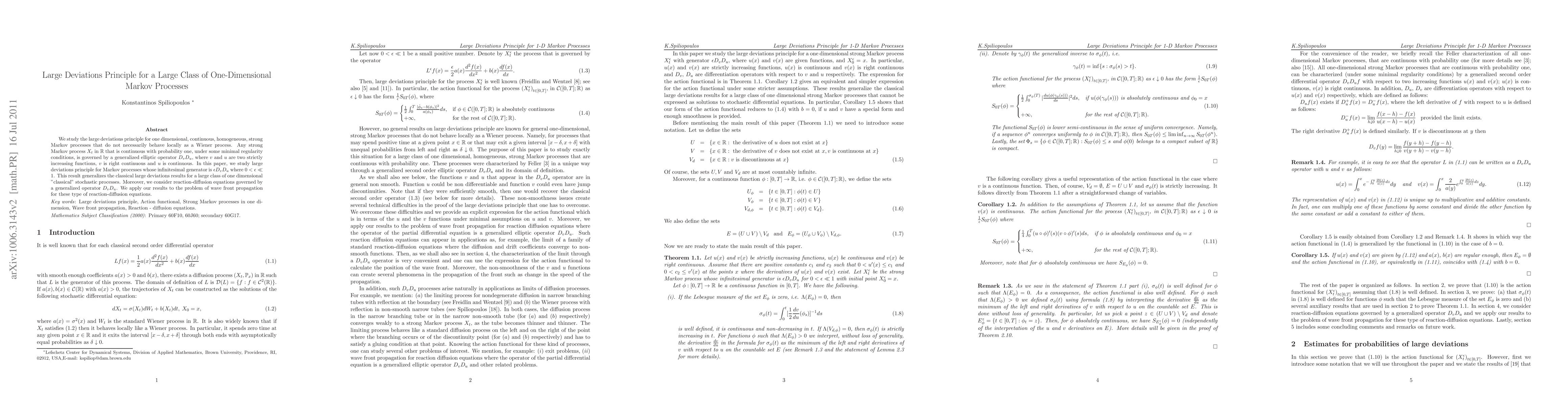 This paper explores the large deviations principle for continuous, homogeneous strong Markov processes in one dimension, generalizing beyond Wiener processes. It applies to processes governed by a generalized elliptic operator and extends classical large deviations to a broad class of stochastic processes, with implications for reaction-diffusion equations and wave front propagation.