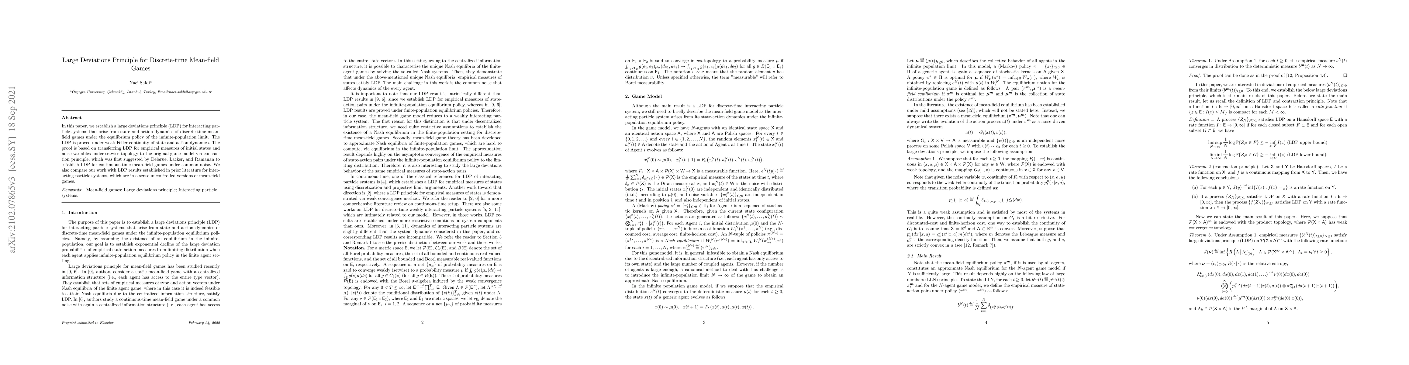 This paper establishes a large deviations principle (LDP) for discrete-time mean-field games, proving it under weak Feller continuity. The proof leverages the contraction principle to transfer LDP from empirical measures to the game model, extending prior results for uncontrolled interacting particle systems.