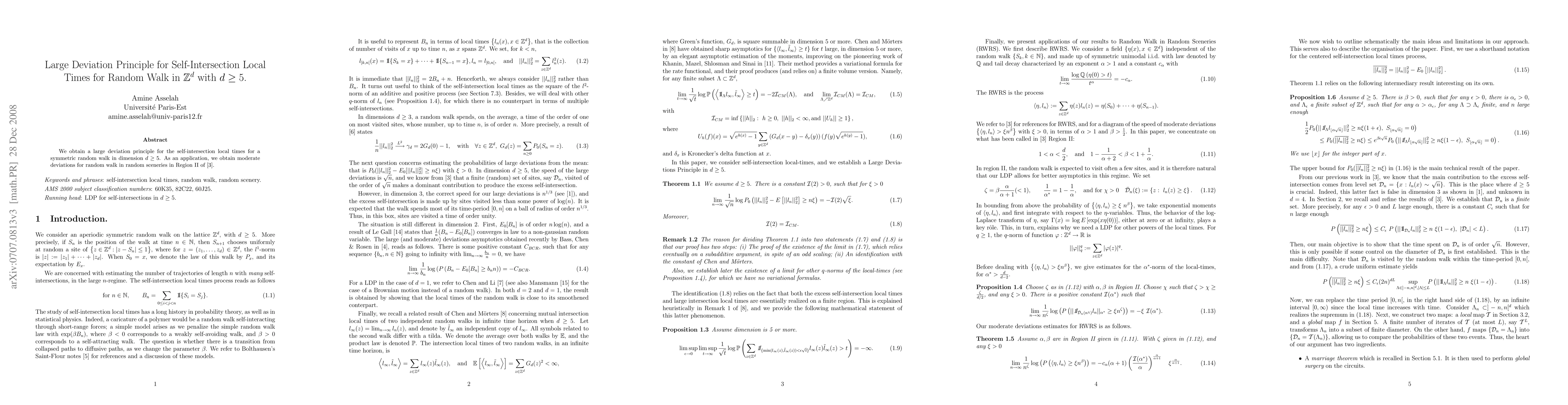 Summary: This paper establishes a large deviations principle for self-intersection local times of a symmetric random walk in dimensions greater than 4, and applies this result to derive moderate deviations for random walks in random environments.