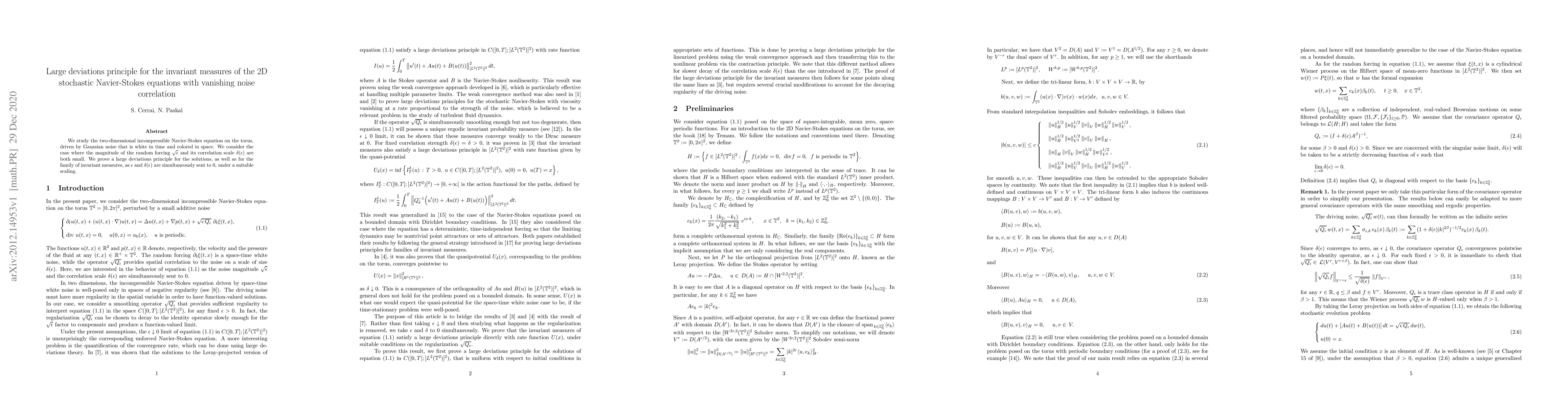 We study the two-dimensional incompressible Navier-Stokes equation on the torus, driven by Gaussian noise that is white in time and colored in space. We consider the case where the magnitude of the random forcing $\sqrt{\e}$ and its correlation scale $\delta(\e)$ are both small. We prove a large deviations principle for the solutions, as well as for the family of invariant measures, as $\e$ and $\delta(\e)$ are simultaneously sent to $0$, under a suitable scaling.