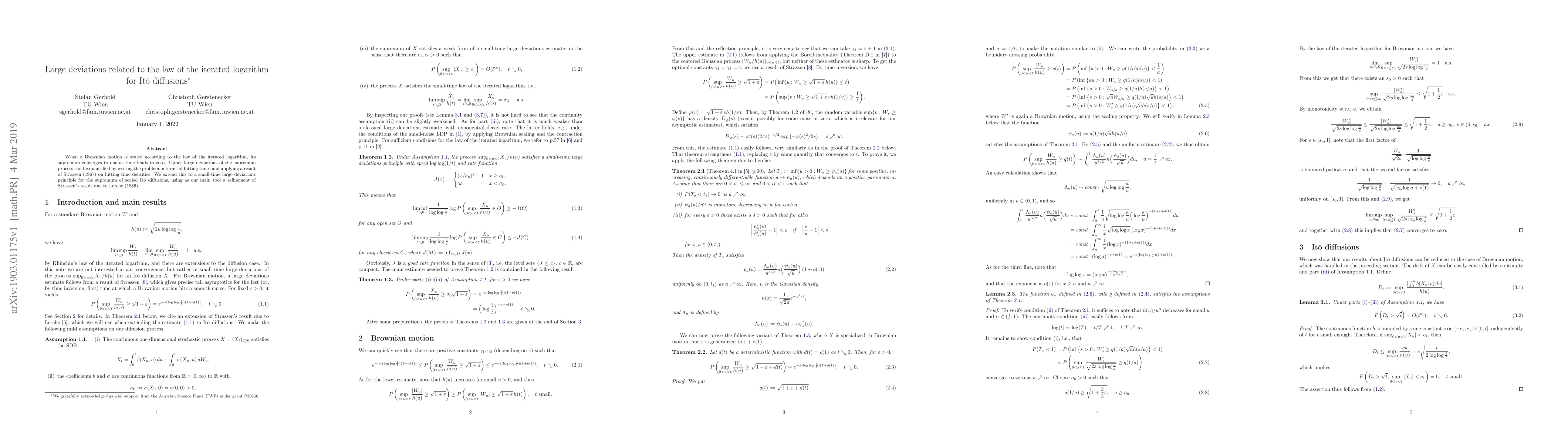 This paper investigates the large deviations behavior of the supremum of scaled Ito diffusions near zero time, extending Strassen's result on hitting time densities to this context. It employs a refined result from Lerche to establish a small-time large deviations principle for these processes.