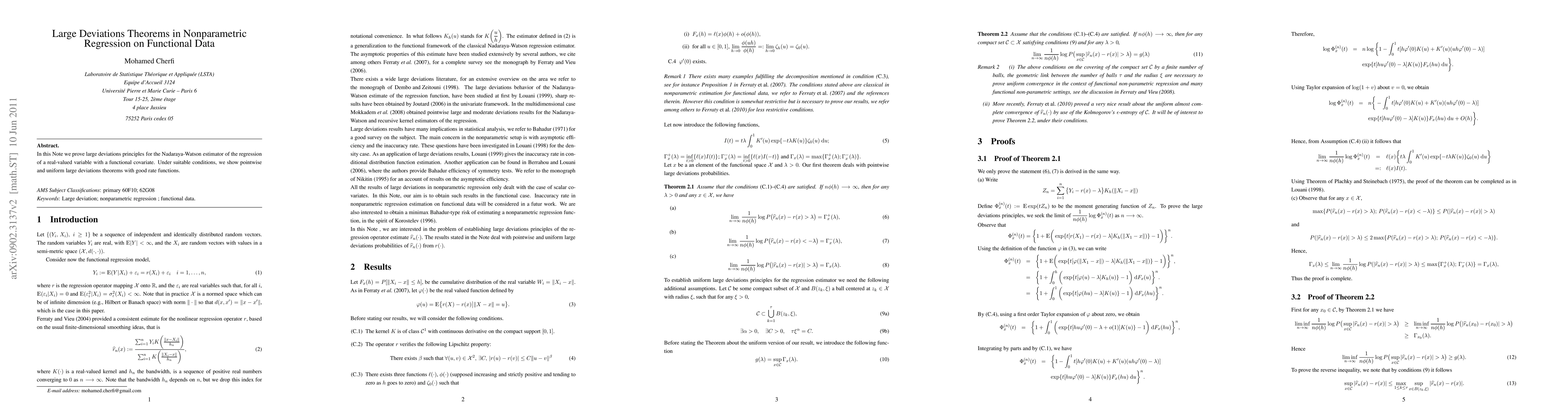 This paper establishes large deviations principles for the Nadaraya-Watson estimator in nonparametric regression involving functional covariates, demonstrating both pointwise and uniform large deviations theorems with well-defined rate functions.