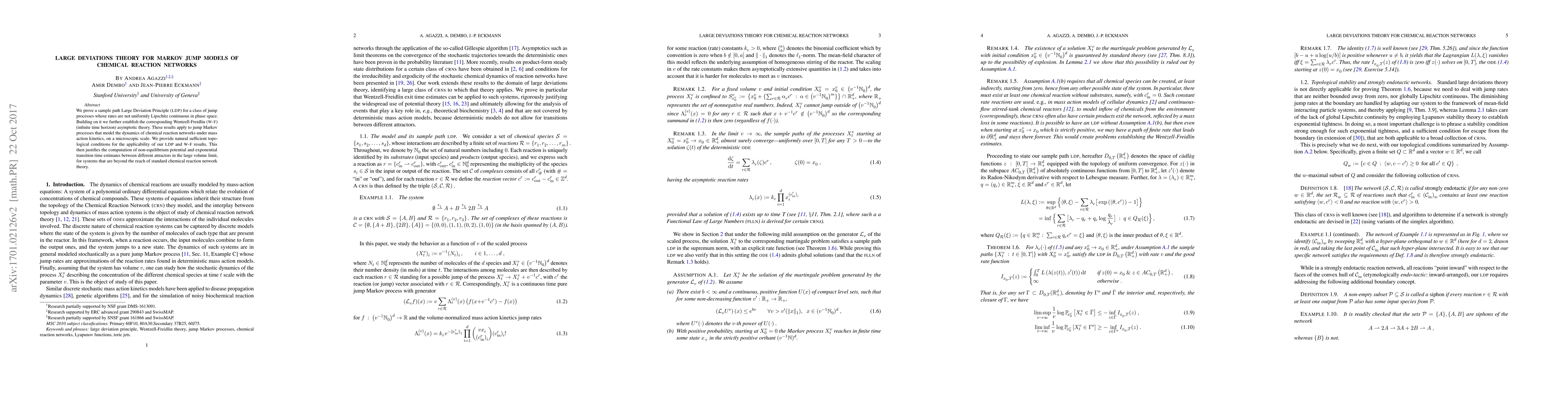 The paper employs large deviation theory to establish a sample path Large Deviation Principle (LDP) and the corresponding Wentzell-Freidlin (W-F) theory for jump Markov processes modeling chemical reaction networks under mass action kinetics on a microscopic scale.
