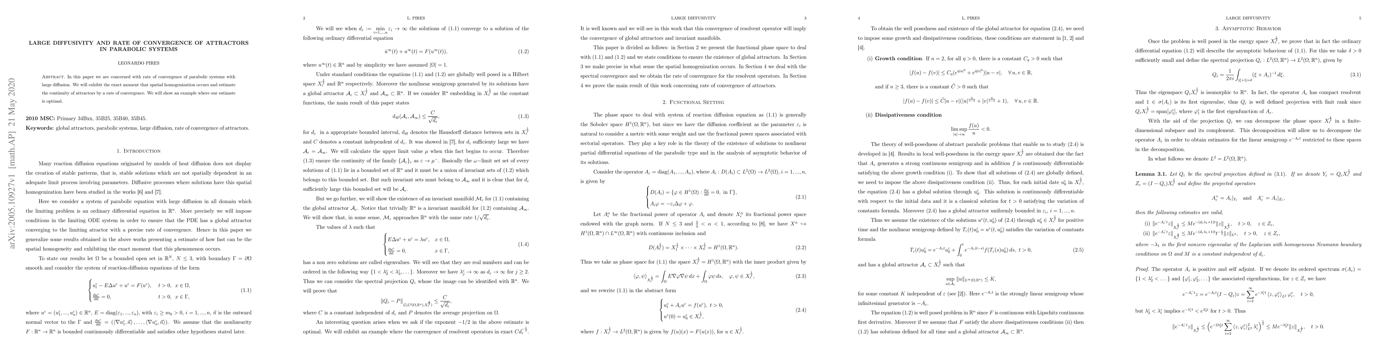 In this paper we are concerned with rate of convergence of parabolic systems with large diffusion. We will exhibit the exact moment that spatial homogenization occurs and estimate the continuity of attractors by a rate of convergence. We will show an example where our estimate is optimal.