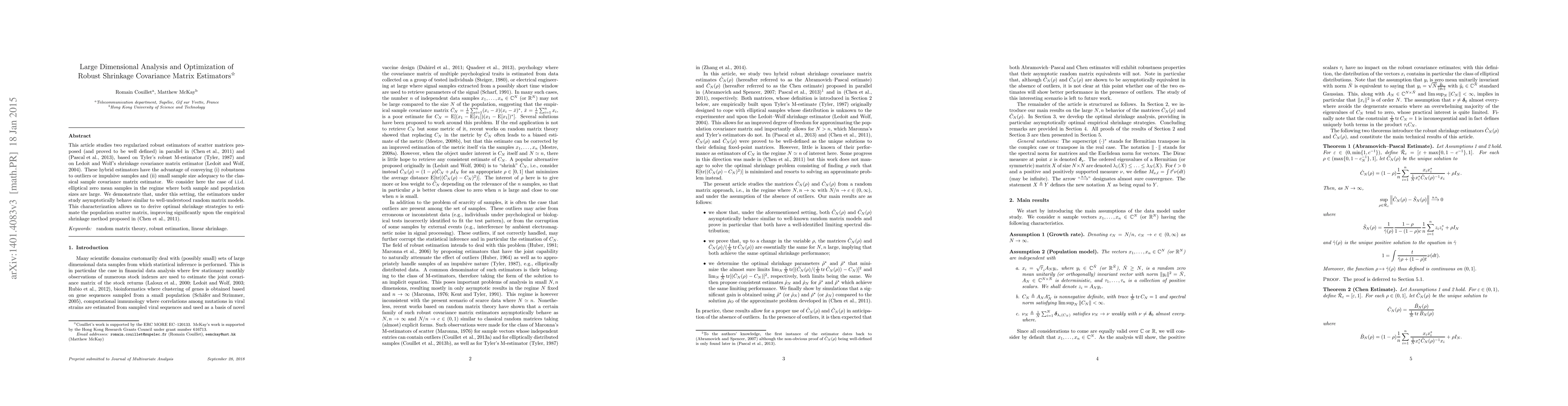 This article studies two regularized robust estimators of scatter matrices proposed (and proved to be well defined) in parallel in (Chen et al., 2011) and (Pascal et al., 2013), based on Tyler's robust M-estimator (Tyler, 1987) and on Ledoit and Wolf's shrinkage covariance matrix estimator (Ledoit and Wolf, 2004). These hybrid estimators have the advantage of conveying (i) robustness to outliers or impulsive samples and (ii) small sample size adequacy to the classical sample covariance matrix estimator. We consider here the case of i.i.d. elliptical zero mean samples in the regime where both sample and population sizes are large. We demonstrate that, under this setting, the estimators under study asymptotically behave similar to well-understood random matrix models. This characterization allows us to derive optimal shrinkage strategies to estimate the population scatter matrix, improving significantly upon the empirical shrinkage method proposed in (Chen et al., 2011).