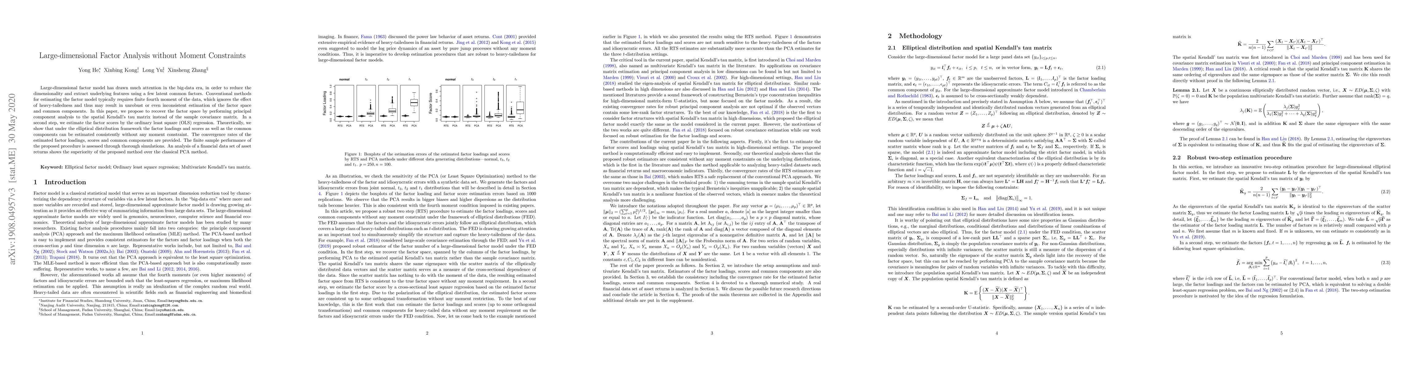 This paper introduces a novel method for estimating large-dimensional factor models without relying on moment constraints. It proposes using principal component analysis on the spatial Kendall's tau matrix, followed by ordinary least squares regression for factor scores. The method is shown to consistently estimate factor loadings, scores, and common components under elliptical distribution, with convergence rates provided. Simulations and a financial data analysis demonstrate its superior performance over classical PCA.