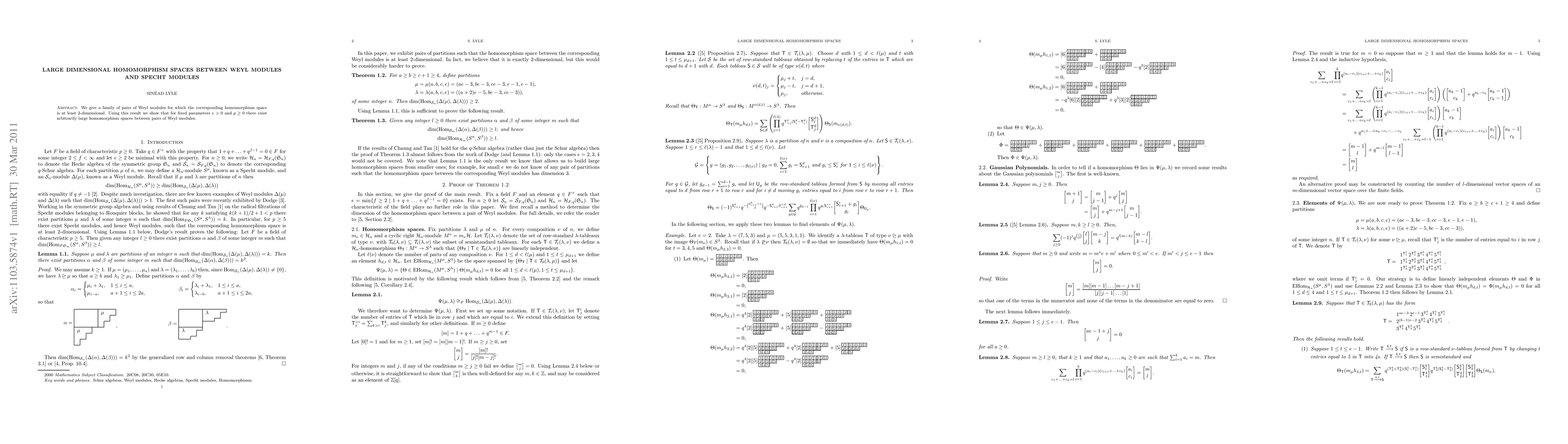 Summary: The paper establishes that certain pairs of Weyl modules have at least a 2-dimensional homomorphism space, demonstrating the existence of arbitrarily large homomorphism spaces between Weyl modules for specific parameters.