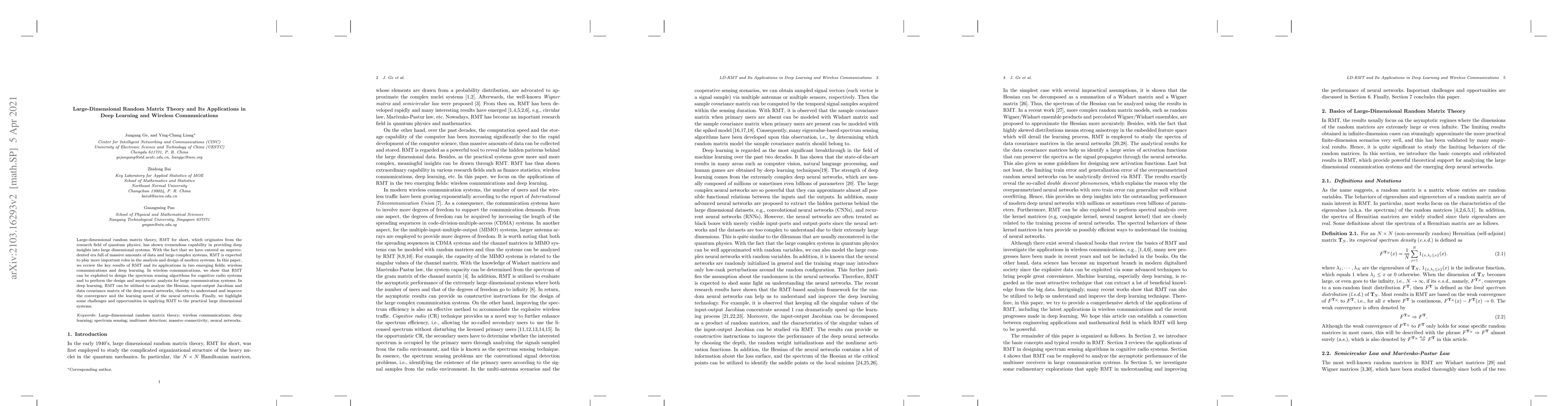 This paper reviews the key results of large-dimensional random matrix theory (RMT) and its applications in wireless communications and deep learning. It highlights RMT's role in designing spectrum sensing algorithms and analyzing large communication systems, as well as its utility in understanding and improving the convergence and learning speed of deep neural networks.