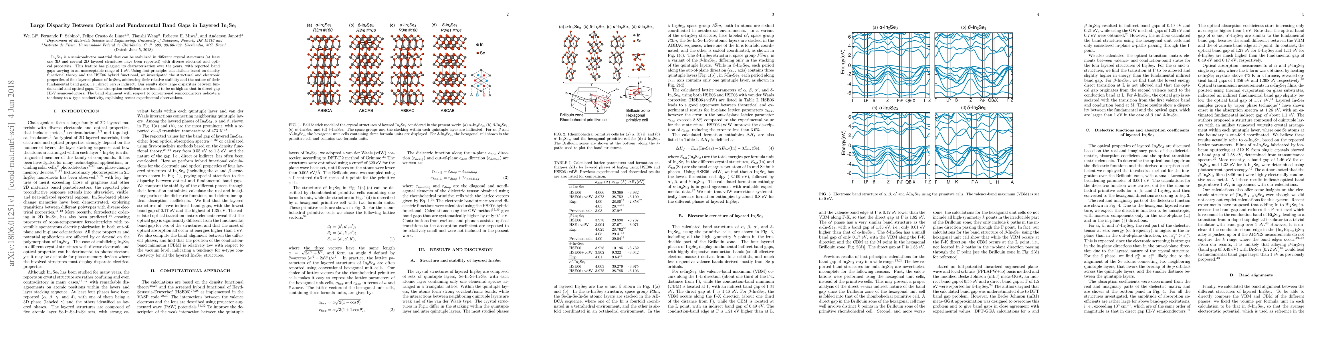 In$_2$Se$_3$ is a semiconductor material that can be stabilized in different crystal structures (at least one 3D and several 2D layered structures have been reported) with diverse electrical and optical properties. This feature has plagued its characterization over the years, with reported band gaps varying in an unacceptable range of 1 eV. Using first-principles calculations based on density functional theory and the HSE06 hybrid functional, we investigated the structural and electronic properties of four layered phases of In$_2$Se$_3$, addressing their relative stability and the nature of their fundamental band gaps, i.e., direct {\em versus} indirect. Our results show large disparities between fundamental and optical gaps. The absorption coefficients are found to be as high as that in direct-gap III-V semiconductors. The band alignment with respect to conventional semiconductors indicate a tendency to $n$-type conductivity, explaining recent experimental observations.