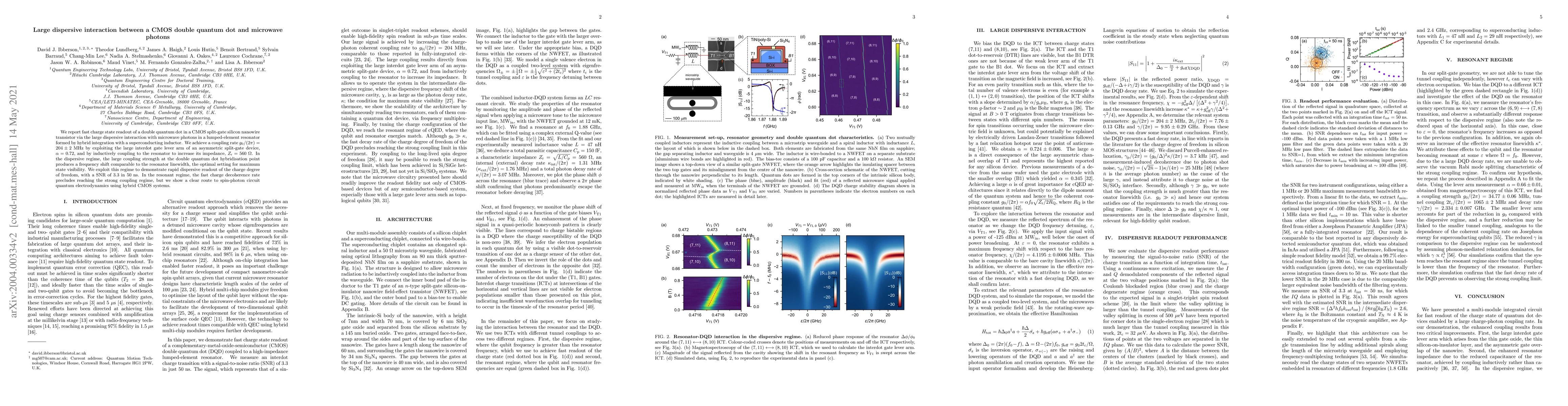 This paper reports on the fast charge state readout of a CMOS double quantum dot via large dispersive interaction with microwave photons in a resonator, achieving a coupling rate of 204 MHz. The study demonstrates rapid dispersive readout with a 3.3 SNR in 50 ns, highlighting the potential for spin-photon circuit quantum electrodynamics in hybrid CMOS systems.
