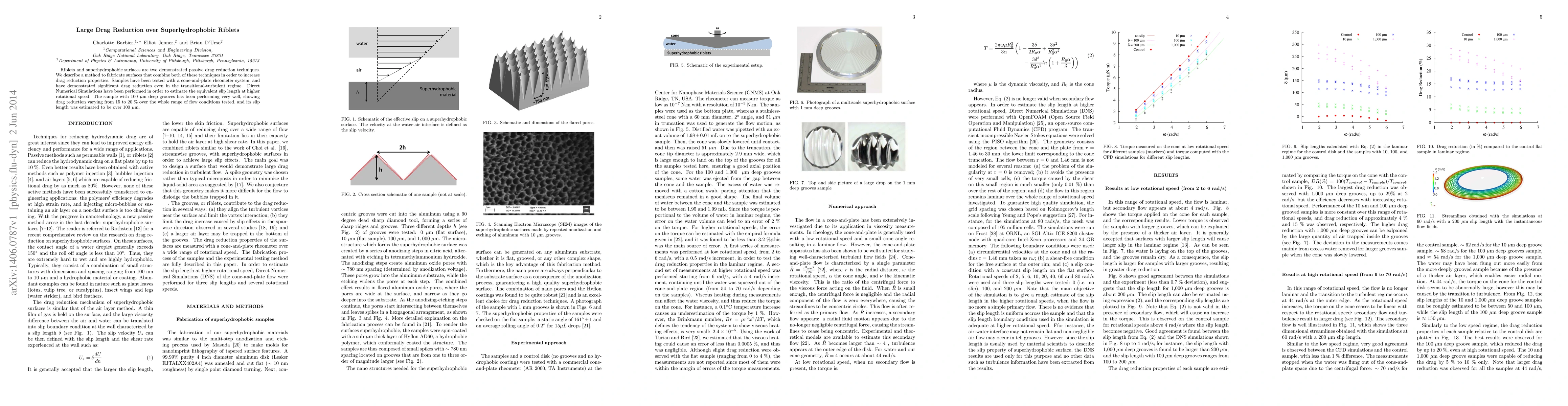 Riblets and superhydrophobic surfaces are two demonstrated passive drag reduction techniques. We describe a method to fabricate surfaces that combine both of these techniques in order to increase drag reduction properties. Samples have been tested with a cone-and-plate rheometer system, and have demonstrated significant drag reduction even in the transitional-turbulent regime. Direct Numerical Simulations have been performed in order to estimate the equivalent slip length at higher rotational speed. The sample with 100~$\mu$m deep grooves has been performing very well, showing drag reduction varying from 15 to 20 $\%$ over the whole range of flow conditions tested, and its slip length was estimated to be over 100 $\mu$m.