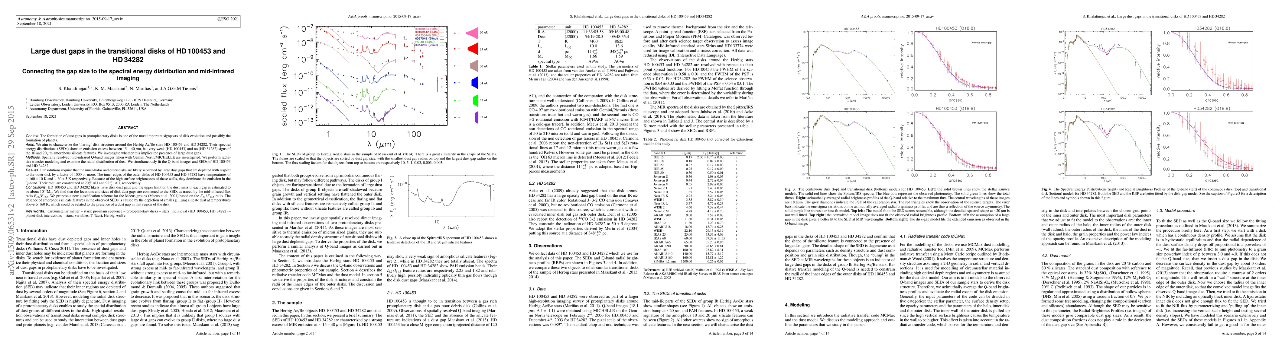 The study of two Herbig Ae/Be stars reveals large dust gaps in their transitional disks, which are linked to the emission excesses observed between 15-40μm.