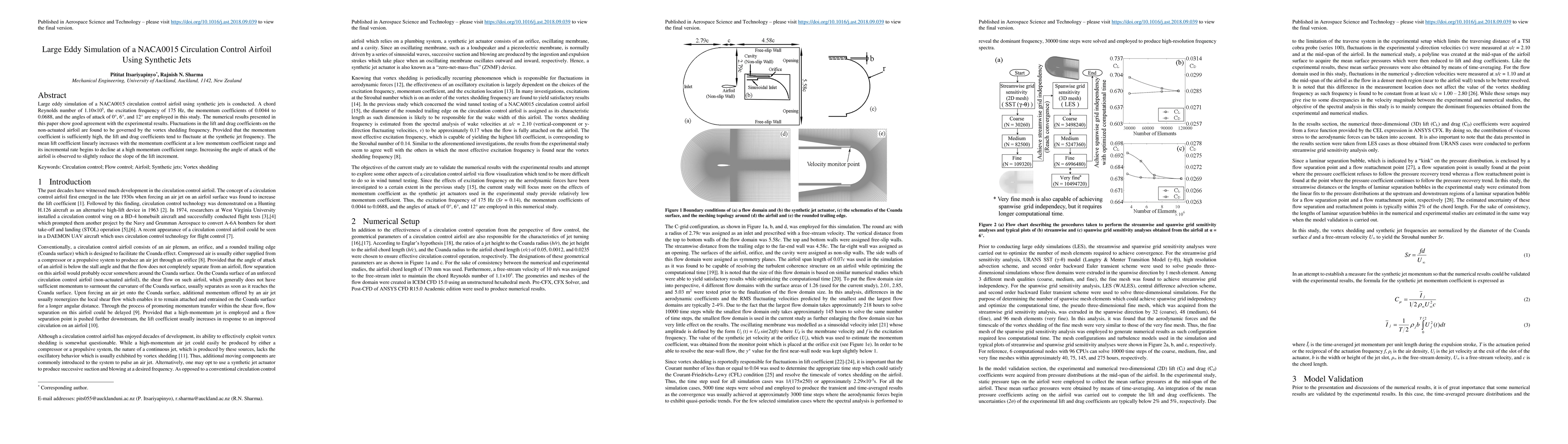 This paper presents large eddy simulations of a NACA0015 circulation control airfoil using synthetic jets, showing good agreement with experimental results. The study finds that lift and drag fluctuations are governed by vortex shedding frequency, with lift increasing linearly with momentum coefficient until a saturation point.
