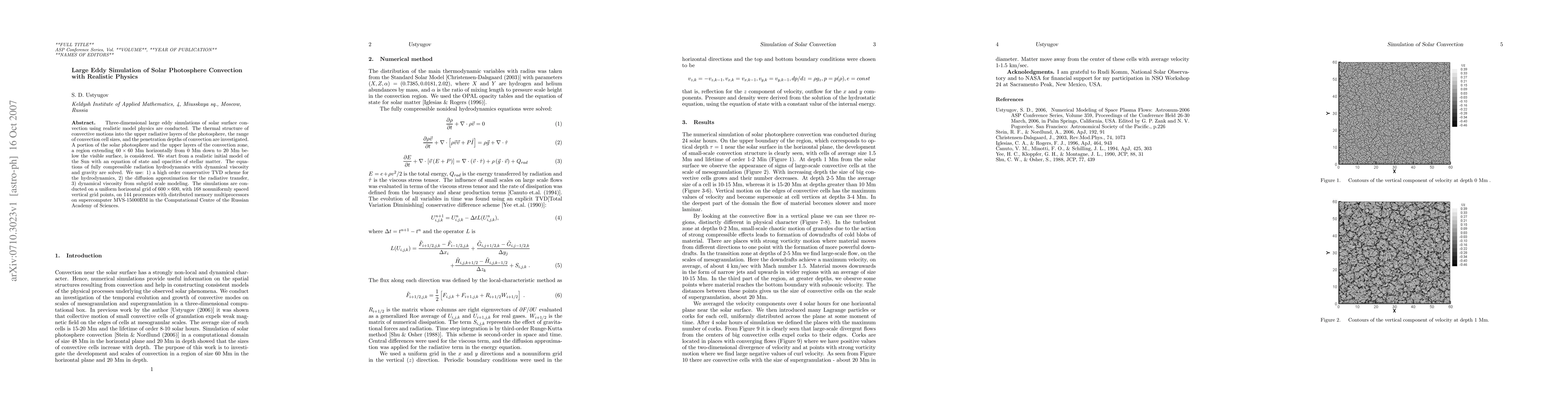 This research uses large eddy simulations with realistic physics to study solar photosphere convection. Key findings include detailed analysis of convective motion thermal structure, cell sizes, and penetration depths in the photosphere and upper convection zone, employing advanced numerical methods and high-performance computing.