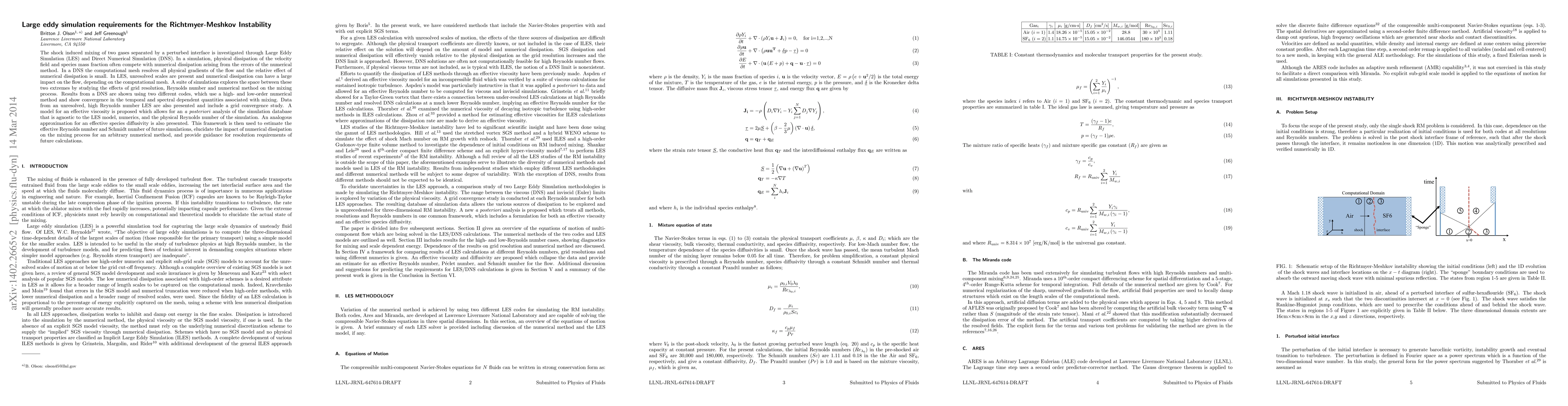 This paper investigates the shock-induced mixing of two gases using Large Eddy Simulation (LES) and Direct Numerical Simulation (DNS), exploring the effects of grid resolution and numerical methods. It proposes models for effective viscosity and species diffusivity to analyze the impact of numerical dissipation and guide future simulation resolutions.