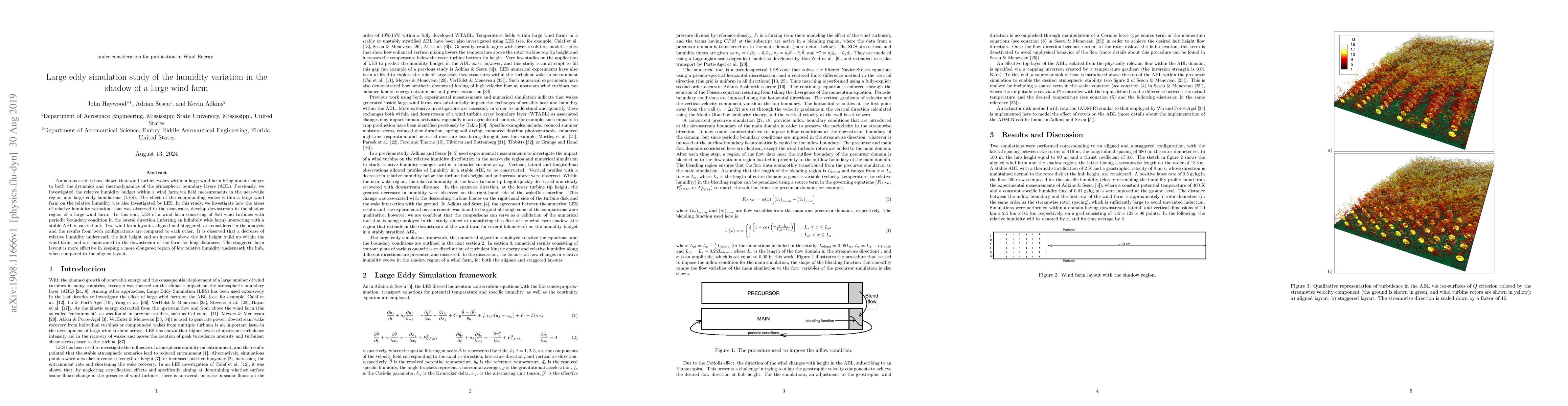 This study uses large eddy simulations to analyze the humidity variations in the shadow of a large wind farm, finding that relative humidity decreases below hub height and increases above it, with staggered layouts more effective in maintaining elongated low humidity regions compared to aligned layouts.