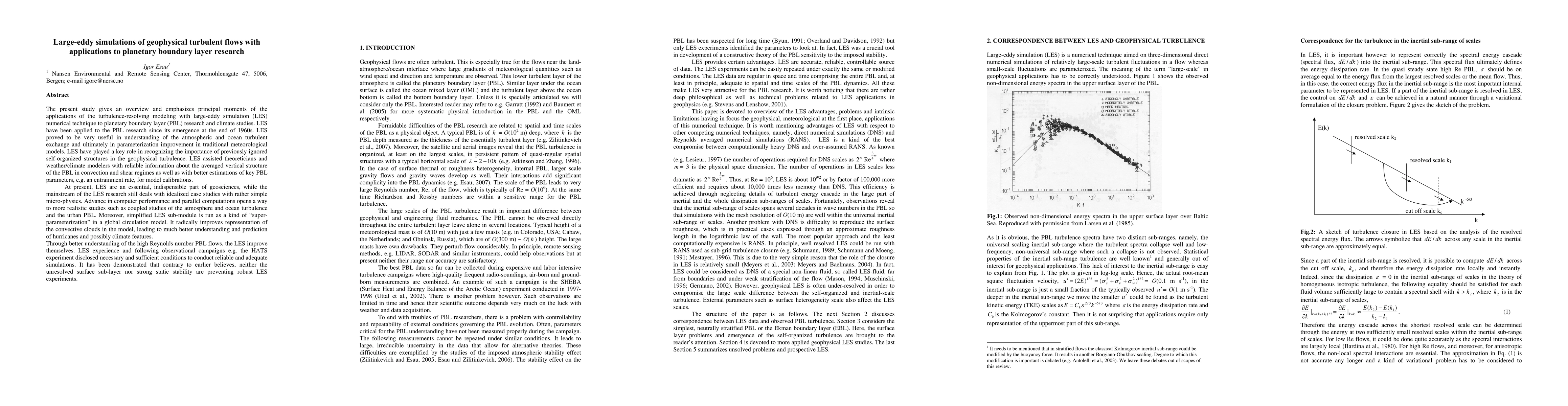 This paper reviews the application of large-eddy simulation (LES) in understanding geophysical turbulent flows, particularly in the planetary boundary layer (PBL). LES has significantly improved the parameterization of atmospheric and oceanic turbulence, revealing self-organized structures and aiding in the calibration of meteorological models.