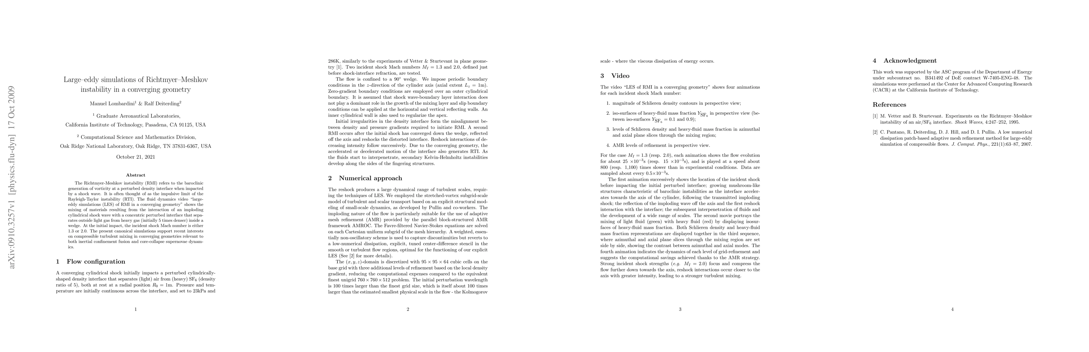This paper presents large-eddy simulations of Richtmyer-Meshkov instability in a converging geometry, focusing on the mixing dynamics when an imploding shock wave interacts with a perturbed density interface separating light and heavy gases. The study supports research on compressible turbulent mixing in contexts like inertial fusion and supernova dynamics.