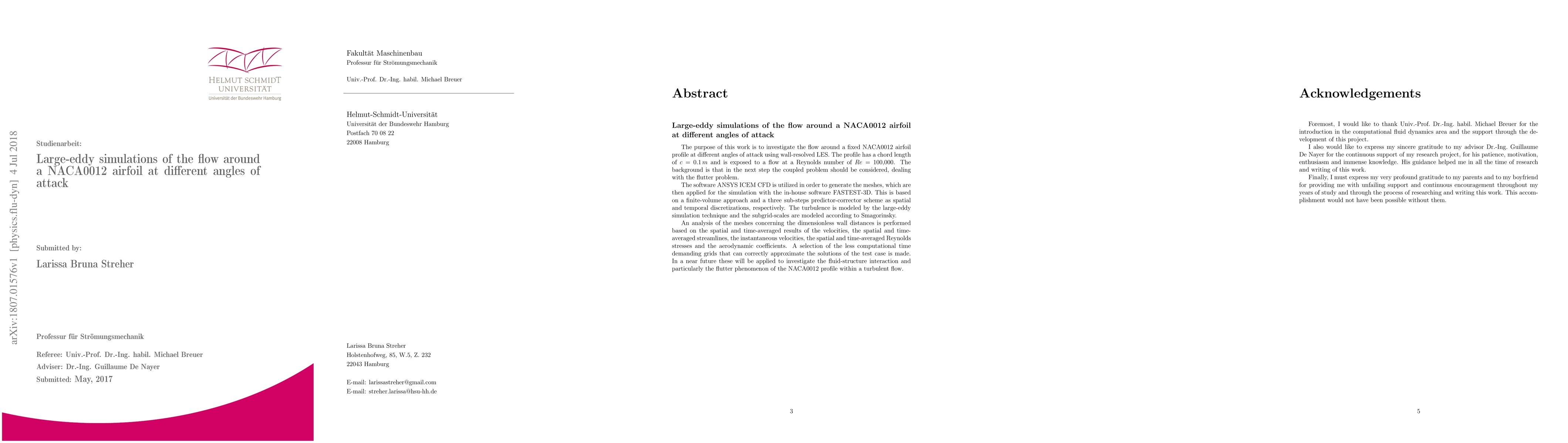 This study uses large-eddy simulations to investigate airflow around a NACA0012 airfoil at different angles of attack, with the goal of understanding its behavior in preparation for studying fluid-structure interaction and flutter.