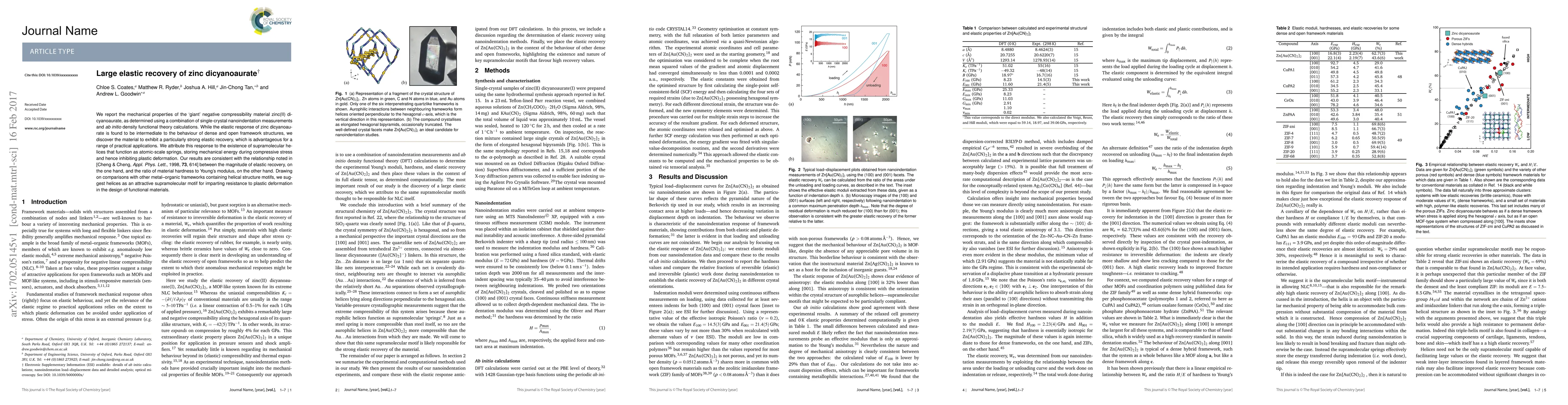 We report the mechanical properties of the `giant' negative compressibility material zinc(II) dicyanoaurate, as determined using a combination of single-crystal nanoindentation measurements and \emph{ab initio} density functional theory calculations. While the elastic response of zinc dicyanoaurate is found to be intermediate to the behaviour of dense and open framework structures, we discover the material to exhibit a particularly strong elastic recovery, which is advantageous for a range of practical applications. We attribute this response to the existence of supramolecular helices that function as atomic-scale springs, storing mechanical energy during compressive stress and hence inhibiting plastic deformation. Our results are consistent with the relationship noted in [Cheng \& Cheng, \textit{Appl. Phys. Lett.}, 1998, {\textbf{73}}, 614] between the magnitude of elastic recovery, on the one hand, and the ratio of material hardness to Young's modulus, on the other hand. Drawing on comparisons with other metal--organic frameworks containing helical structure motifs, we suggest helices as an attractive supramolecular motif for imparting resistance to plastic deformation in the design of functional materials.