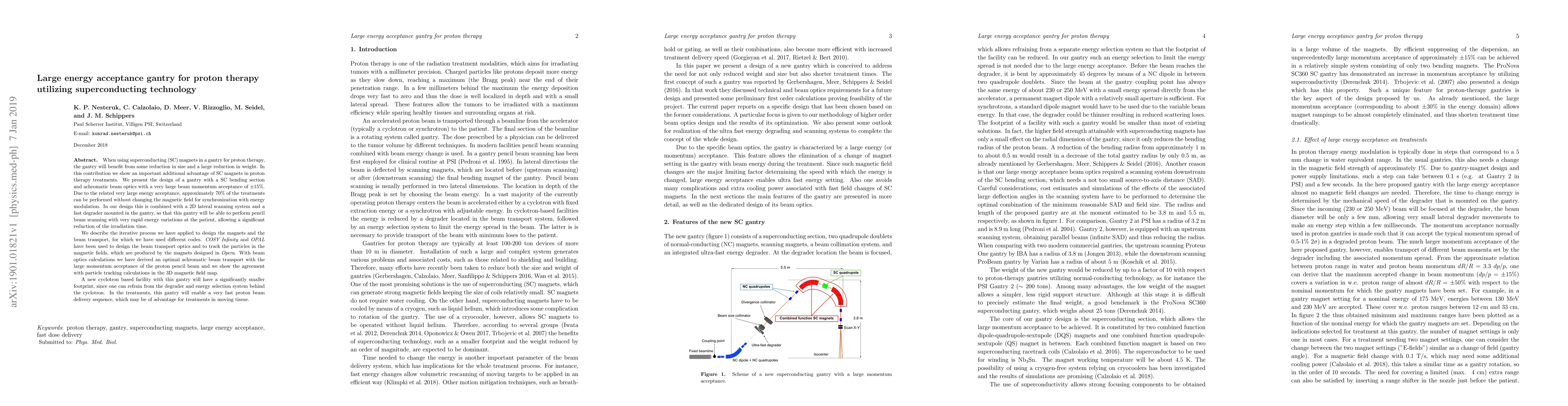 This paper presents the design of a large energy acceptance gantry for proton therapy using superconducting magnets, which significantly reduces size and weight. The gantry features a SC bending section and achromatic beam optics with a momentum acceptance of ±15%, allowing 70% of treatments to proceed without magnetic field adjustments, thus reducing irradiation time.
