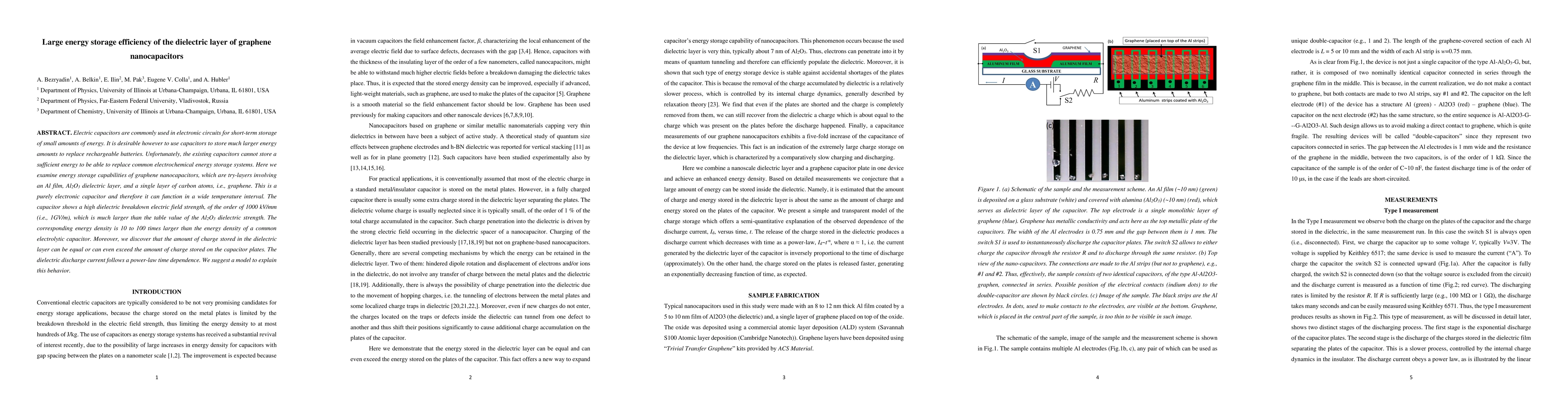 This paper investigates the large energy storage efficiency of graphene nanocapacitors, revealing their potential to store significantly more energy than conventional electrolytic capacitors due to their high dielectric breakdown electric field strength and unique dielectric layer properties. The study finds that the dielectric layer can store as much charge as the capacitor plates, suggesting a new model for understanding their power-law discharge current behavior.
