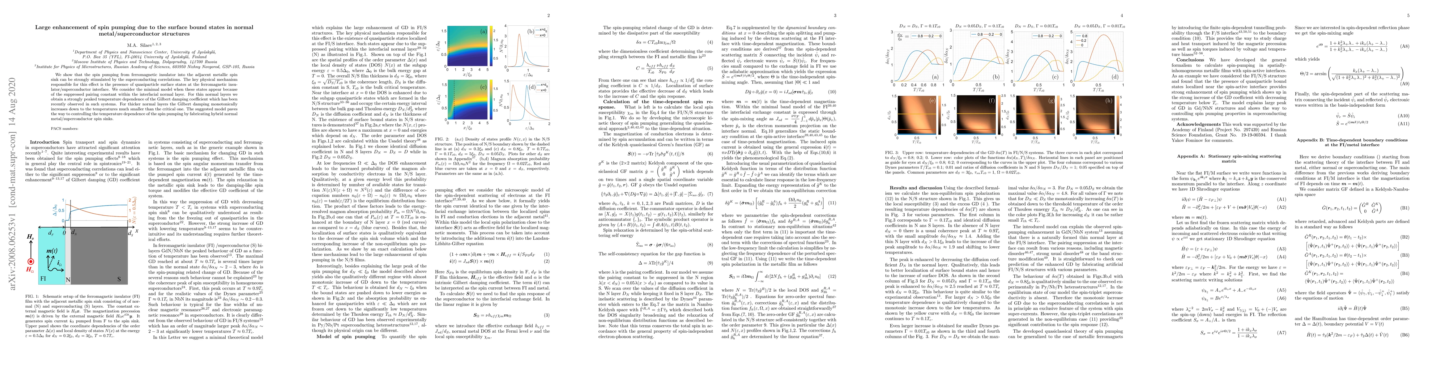 We show that the spin pumping from ferromagnetic insulator into the adjacent metallic spin sink can be strongly stimulated by the superconducting correlations. The key physical mechanism responsible for this effect is the presence of quasiparticle surface states at the ferromagnetic insulator/superconductor interface. We consider the minimal model when these states appear because of the suppressed pairing constant within the interfacial normal layer. For thin normal layers we obtain a strongly peaked temperature dependence of the Gilbert damping coefficient which has been recently observed in such systems. For thicker normal layers the Gilbert damping monotonically increases down to the temperatures much smaller than the critical one. The suggested model paves the way to controlling the temperature dependence of the spin pumping by fabricating hybrid normal metal/superconductor spin sinks.