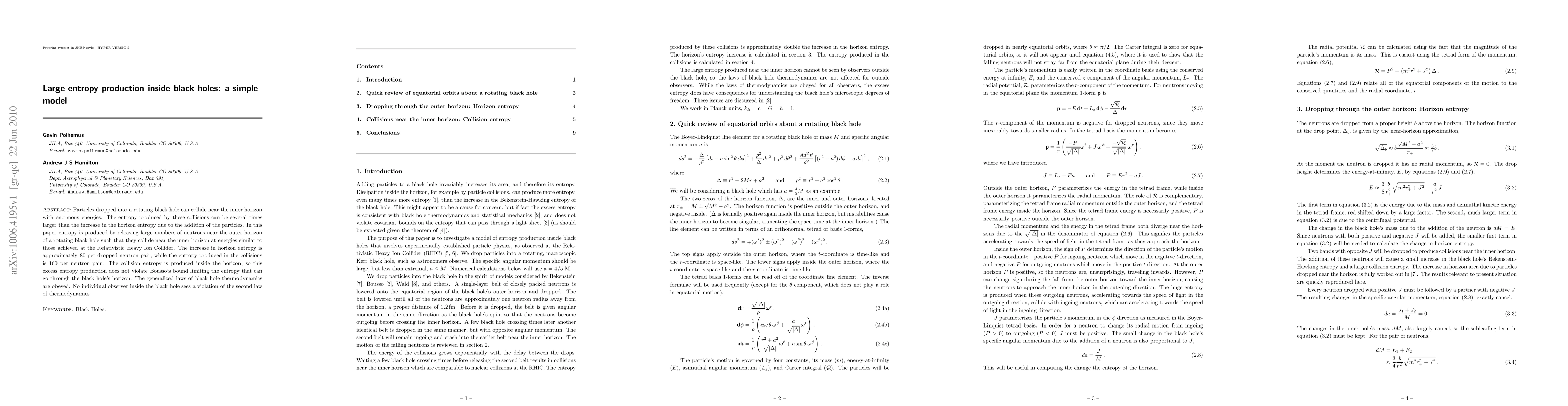 This paper models entropy production inside rotating black holes by simulating high-energy collisions of neutrons dropped near the outer horizon. The collision entropy, significantly larger than the horizon entropy increase, is produced inside the horizon without violating thermodynamic laws or Bousso's bound.