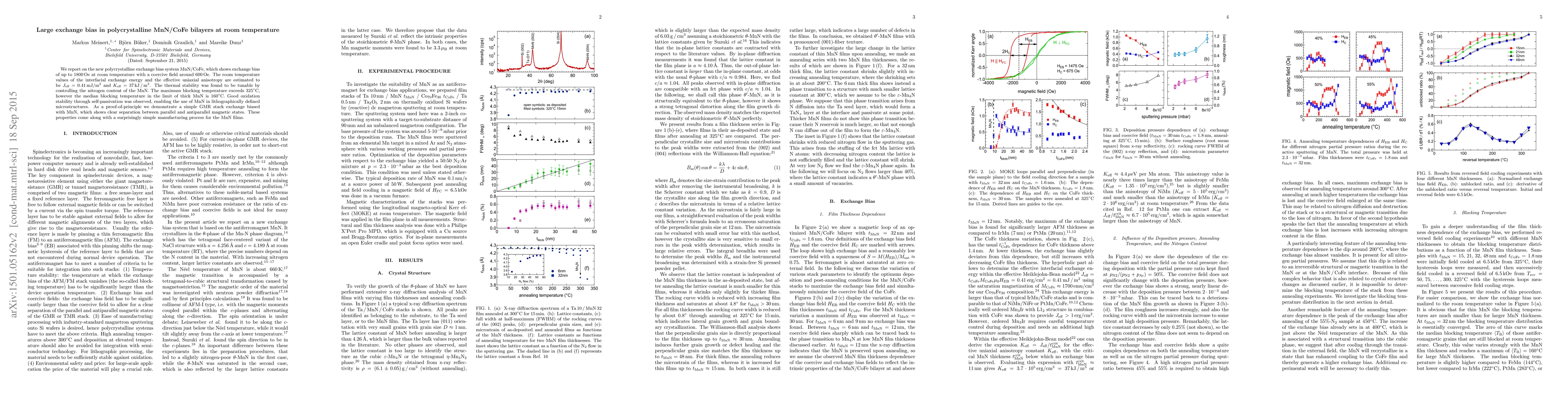 The paper presents a novel polycrystalline MnN/CoFe exchange bias system with large exchange bias at room temperature, high effective anisotropy, and tunable thermal stability, along with good oxidation stability for lithographic processing.