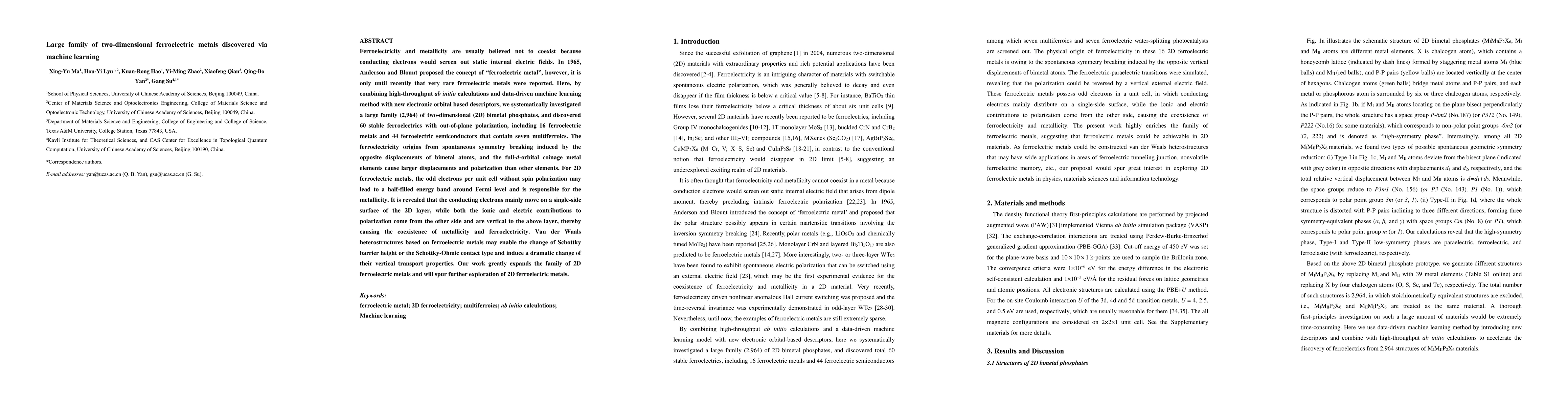 Researchers discovered a large family of 2,964 two-dimensional bimetal phosphates, identifying 60 stable ferroelectrics, including 16 ferroelectric metals, using machine learning and high-throughput calculations. The coexistence of ferroelectricity and metallicity in these materials is attributed to unique electronic and ionic contributions, suggesting potential for novel van der Waals heterostructures.