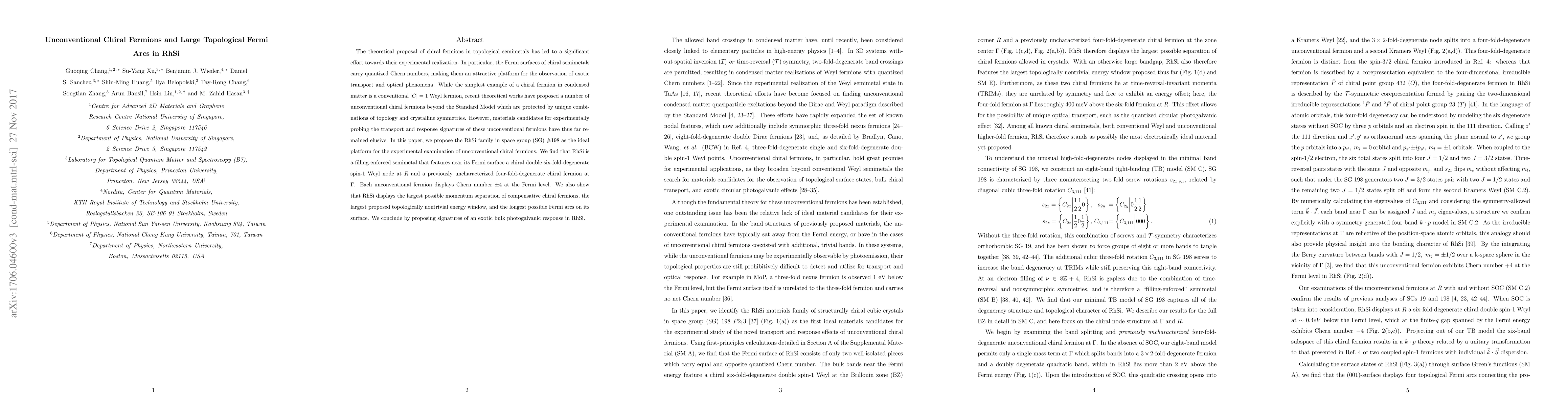 This paper identifies RhSi as a potential material for observing unconventional chiral fermions, specifically highlighting its unique topological properties and large Fermi arcs. It proposes RhSi as an ideal platform for experimental studies on these fermions, characterized by significant topological and transport signatures.