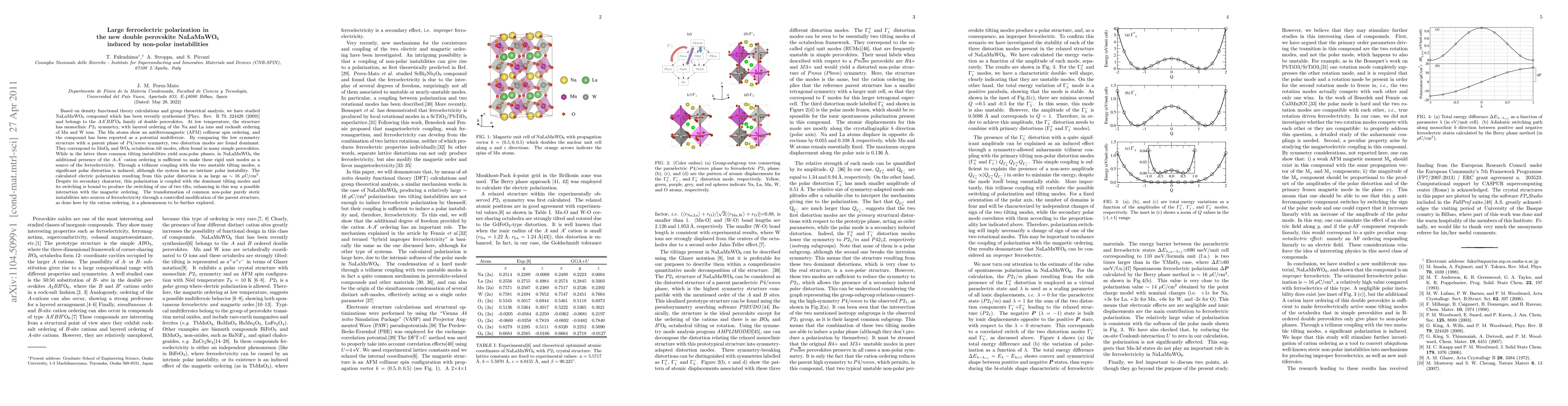 Based on density functional theory calculations and group theoretical analysis, we have studied NaLaMnWO$_{6}$ compound which has been recently synthesized [Phys. Rev. B 79, 224428 (2009)] and belongs to the $AA'BB'{\rm O}_{6}$ family of double perovskites. At low temperature, the structure has monoclinic $P2_{1}$ symmetry, with layered ordering of the Na and La ions and rocksalt ordering of Mn and W ions. The Mn atoms show an antiferromagnetic (AFM) collinear spin ordering, and the compound has been reported as a potential multiferroic. By comparing the low symmetry structure with a parent phase of $P4/nmm$ symmetry, two distortion modes are found dominant. They correspond to MnO$_{6}$ and WO$_{6}$ octahedron \textit{tilt} modes, often found in many simple perovskites. While in the latter these common tilting instabilities yield non-polar phases, in NaLaMnWO$_{6}$ the additional presence of the $A$-$A^{'}$ cation ordering is sufficient to make these rigid unit modes as a source of the ferroelectricity. Through a trilinear coupling with the two unstable tilting modes, a significant polar distortion is induced, although the system has no intrinsic polar instability. The calculated electric polarization resulting from this polar distortion is as large as $\sim$ 16 ${\mu}{\rm C/cm^{2}}$. Despite its secondary character, this polarization is coupled with the dominant tilting modes and its switching is bound to produce the switching of one of two tilts, enhancing in this way a possible interaction with the magnetic ordering. The transformation of common non-polar purely steric instabilities into sources of ferroelectricity through a controlled modification of the parent structure, as done here by the cation ordering, is a phenomenon to be further explored.