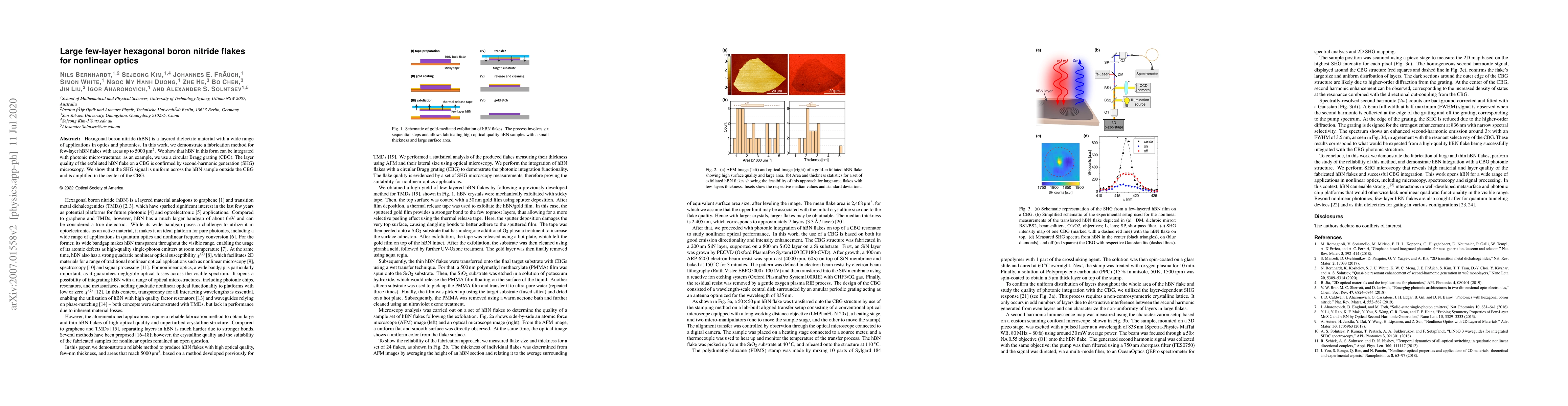 This paper presents a fabrication method for large few-layer hexagonal boron nitride (hBN) flakes, up to 5000 μm, demonstrating their integration with photonic microstructures. Second-harmonic generation (SHG) microscopy confirms the layer quality and shows amplified nonlinear optical response in the center of a circular Bragg grating.