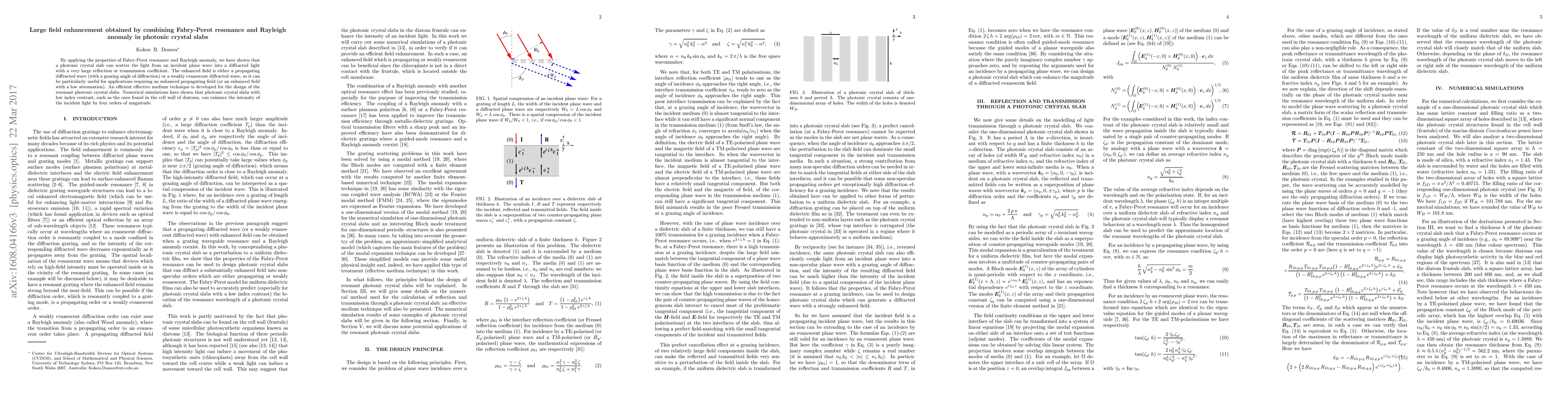 This paper demonstrates that combining Fabry-Perot resonance and Rayleigh anomaly in photonic crystal slabs can achieve significant field enhancement, either in propagating or weakly evanescent diffraction orders, useful for applications needing low attenuation. An efficient effective medium technique is developed for designing such slabs, with simulations showing up to four orders of magnitude light intensity enhancement in low index contrast materials.