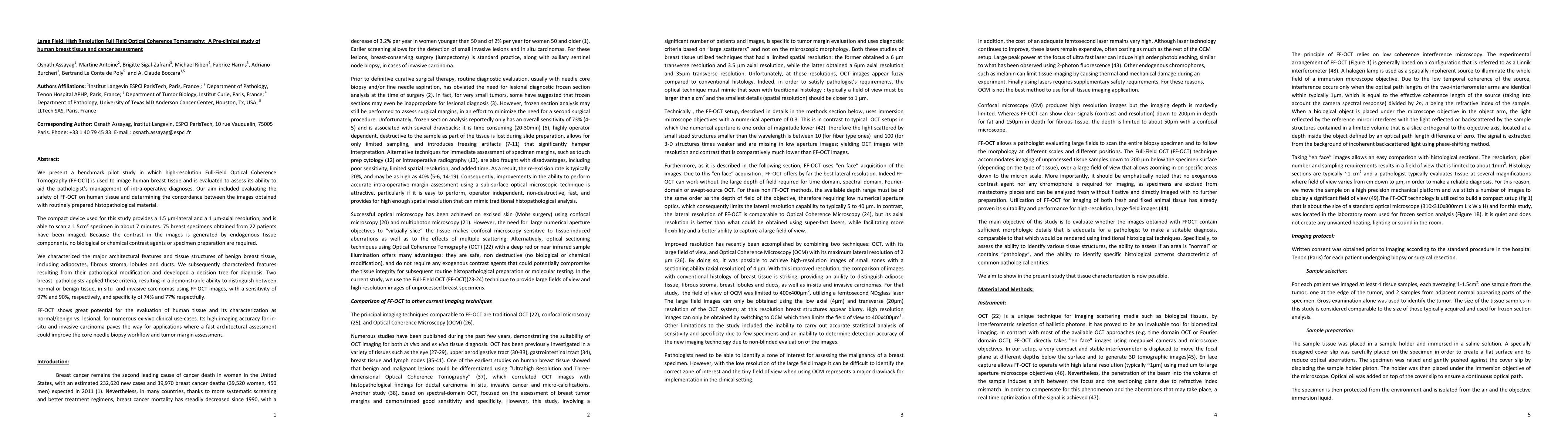 This study evaluates high-resolution Full-Field Optical Coherence Tomography (FF-OCT) for imaging human breast tissue to aid pathologists in intra-operative diagnoses. The FF-OCT device achieved 2 μm lateral and 1 μm axial resolution, imaging 75 breast specimens with high accuracy, distinguishing normal tissue from carcinomas with 97% sensitivity and 74% specificity.