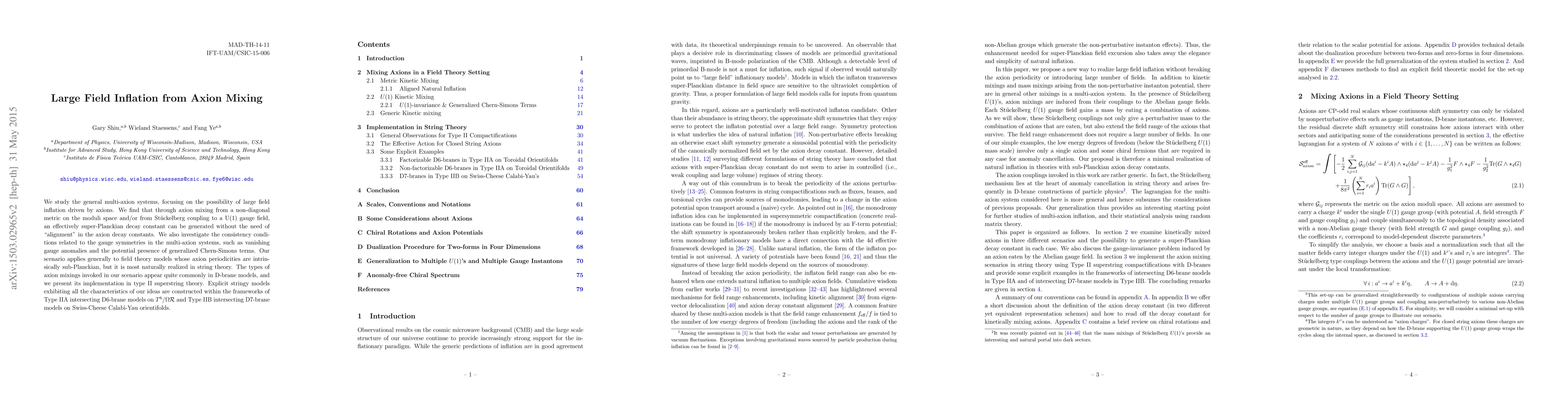 This paper explores large field inflation driven by axions through axion mixing mechanisms, demonstrating how super-Planckian decay constants can arise without alignment. It also examines gauge symmetry consistency and presents string theory models, specifically Type IIA and Type IIB intersecting brane models, that realize these ideas.