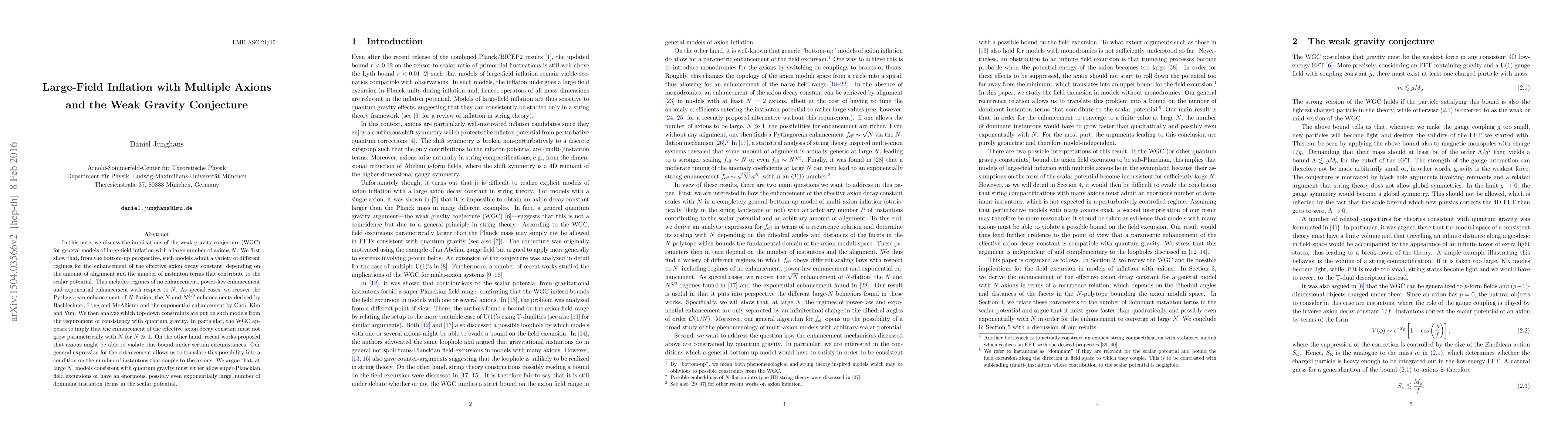 This paper explores the implications of the weak gravity conjecture (WGC) on large-field inflation models with numerous axions, revealing various enhancement regimes for the effective axion decay constant. It concludes that WGC suggests the enhancement cannot grow parametrically with the number of axions, though some models might allow violations under certain conditions.