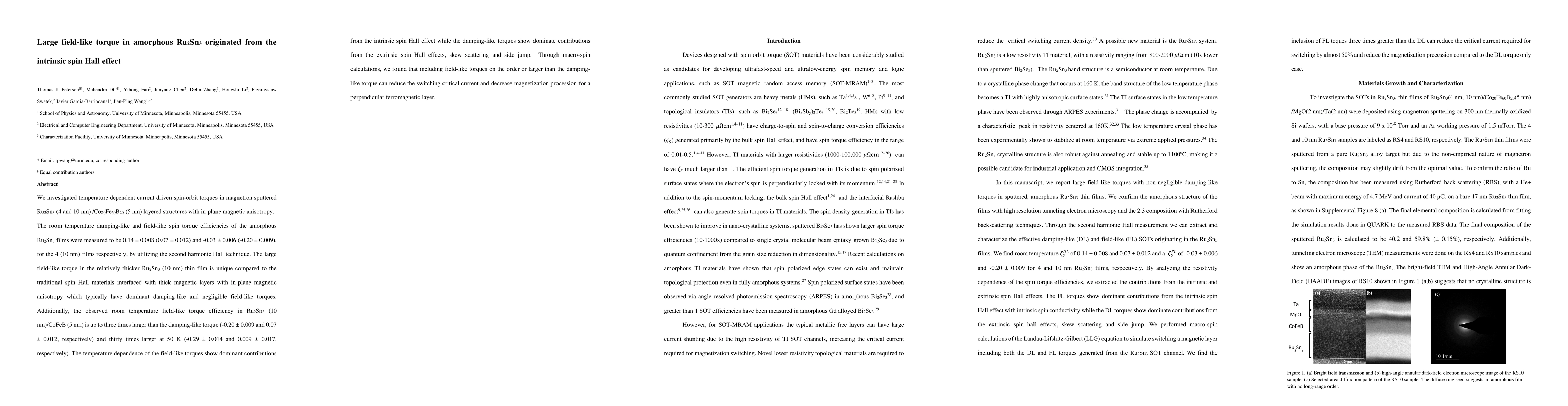 We investigated temperature dependent current driven spin-orbit torques in magnetron sputtered Ru2Sn3 (4 and 10 nm) /Co20Fe60B20 (5 nm) layered structures with in-plane magnetic anisotropy. The room temperature damping-like and field-like spin torque efficiencies of the amorphous Ru2Sn3 films were measured to be 0.14 +- 0.008 (0.07 +- 0.012) and -0.03 +- 0.006 (-0.20 +- 0.009), for the 4 (10 nm) films respectively, by utilizing the second harmonic Hall technique. The large field-like torque in the relatively thicker Ru2Sn3 (10 nm) thin film is unique compared to the traditional spin Hall materials interfaced with thick magnetic layers with in-plane magnetic anisotropy which typically have dominant damping-like and negligible field-like torques. Additionally, the observed room temperature field-like torque efficiency in Ru2Sn3 (10 nm)/CoFeB (5 nm) is up to three times larger than the damping-like torque (-0.20 +- 0.009 and 0.07 +- 0.012, respectively) and thirty times larger at 50 K (-0.29 +- 0.014 and 0.009 +- 0.017, respectively). The temperature dependence of the field-like torques show dominant contributions from the intrinsic spin Hall effect while the damping-like torques show dominate contributions from the extrinsic spin Hall effects, skew scattering and side jump. Through macro-spin calculations, we found that including field-like torques on the order or larger than the damping-like torque can reduce the switching critical current and decrease magnetization procession for a perpendicular ferromagnetic layer.