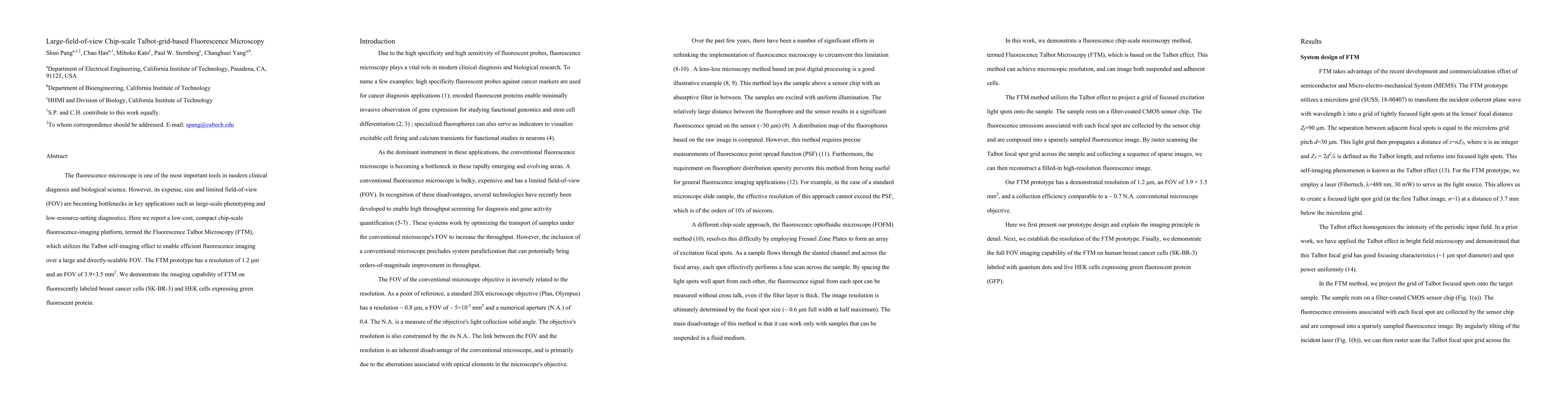 This paper introduces a low-cost, compact chip-scale fluorescence microscopy platform called Fluorescence Talbot Microscopy (FTM) that leverages the Talbot effect for large-field-of-view imaging, addressing the limitations of traditional microscopes in clinical diagnostics and biological research. The FTM prototype achieves a 1.2 micron resolution and a large FOV of 3.9 mm x 3.5 mm, demonstrated through imaging of fluorescently labeled breast cancer and HEK cells.