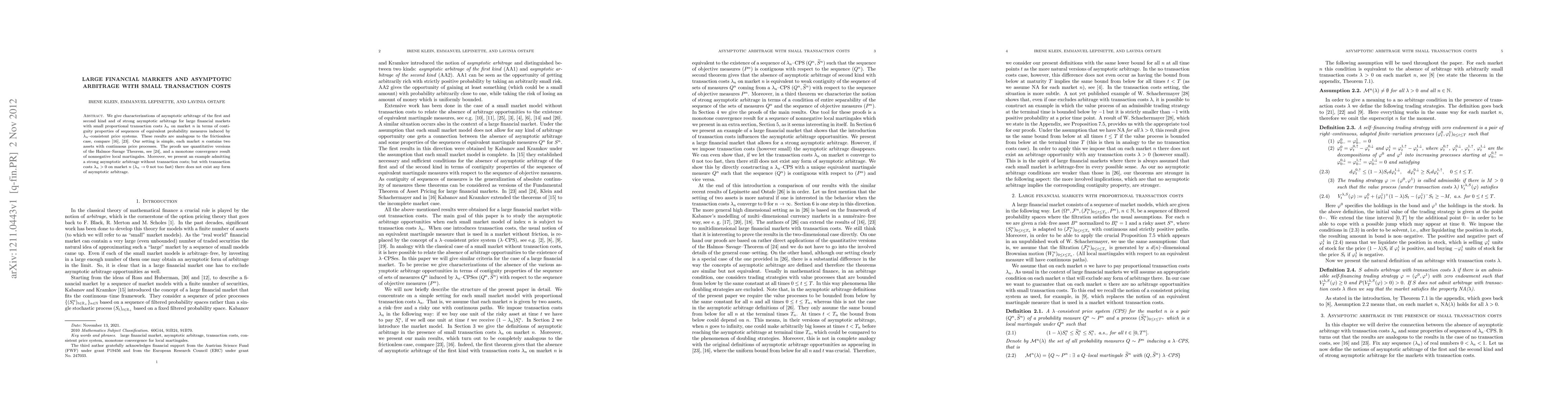 This paper characterizes different types of asymptotic arbitrage in large financial markets with small transaction costs, showing their equivalence to contiguity properties of equivalent probability measures. It demonstrates that under certain conditions, transaction costs can eliminate all forms of asymptotic arbitrage.