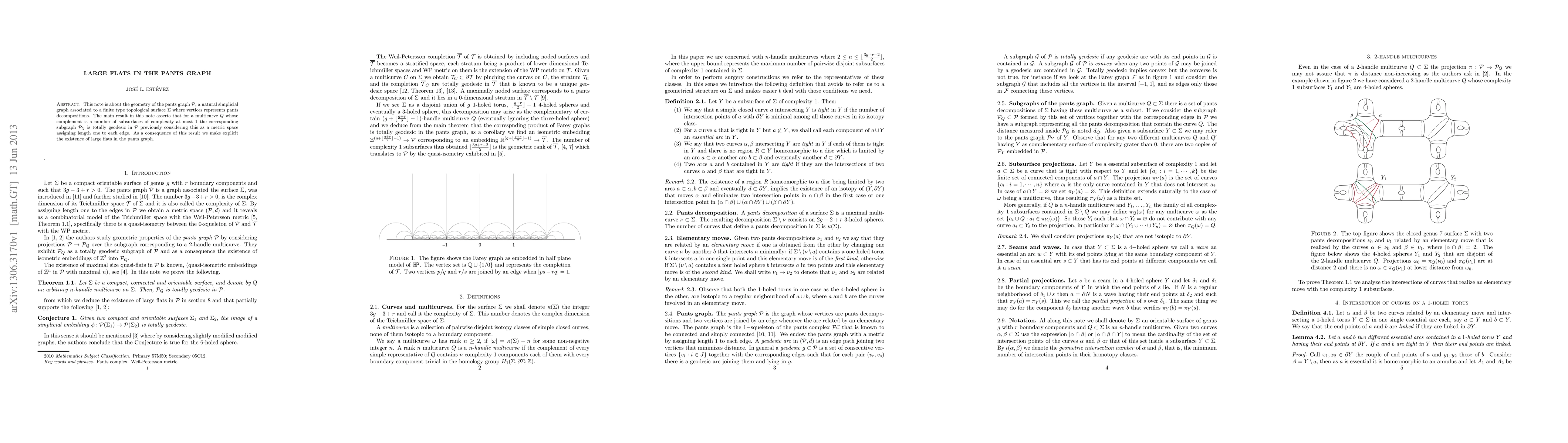 This note is about the geometry of the pants graph P(S), a natural simplicial graph associated to a finite type topological surface S where vertices represents pants decompositions. The main result in this note ascserts that for a multicurve Q whose complement is a number of subsurfaces of complexity at most 1. We prove that the corresponding subgraph P(Q) is totally geodesic in P, previously considering this as a metric space assigning length one to each edge. A flat is a graph isomorphic to the Cayley graph of an abelian torsion free group of finite rank. As a consequence of the main theorem we make explicit the existence of maximal size flats (large flats) in the pants graph.