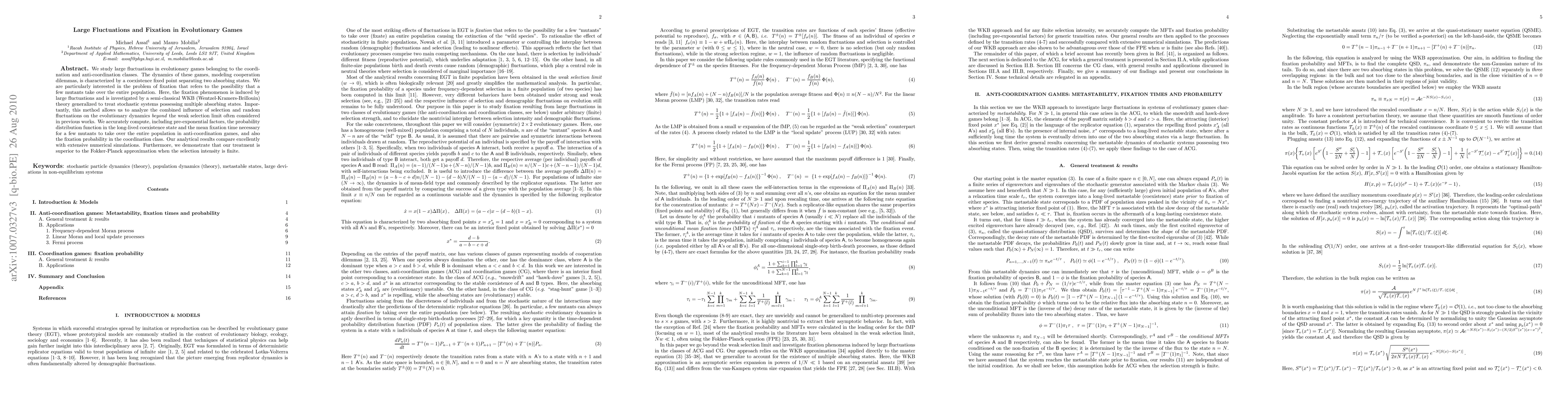 This paper investigates large fluctuations in evolutionary games, focusing on the fixation phenomenon where a few mutants dominate the population. It employs a generalized semi-classical WKB theory to analyze the dynamics beyond the weak selection limit, providing accurate computations of probability distributions and fixation times, which are validated against numerical simulations.
