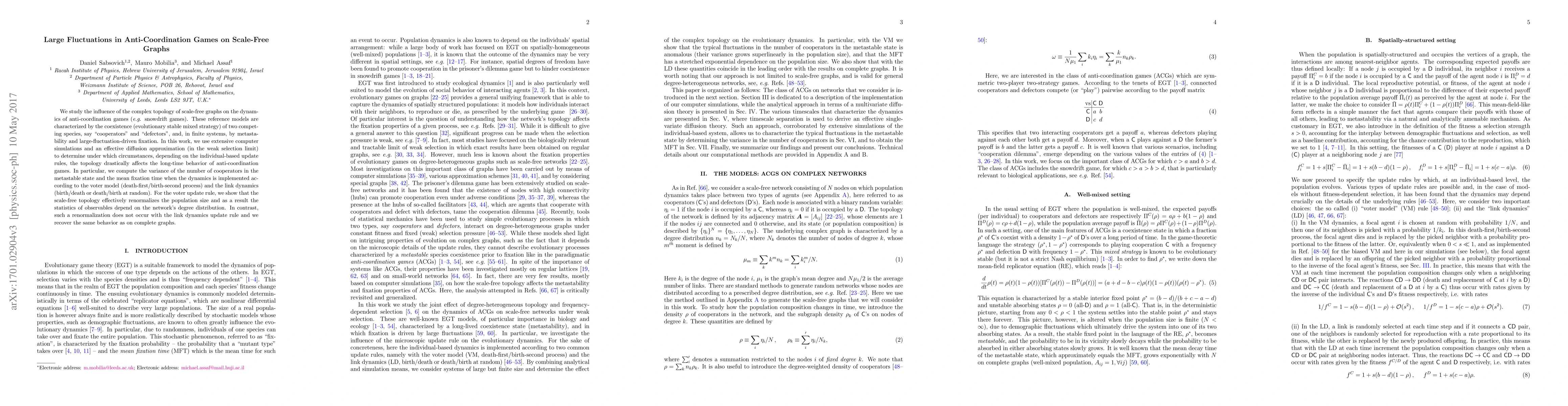 We study the influence of the complex topology of scale-free graphs on the dynamics of anti-coordination games (e.g. snowdrift games). These reference models are characterized by the coexistence (evolutionary stable mixed strategy) of two competing species, say "cooperators" and "defectors", and, in finite systems, by metastability and large-fluctuation-driven fixation. In this work, we use extensive computer simulations and an effective diffusion approximation (in the weak selection limit) to determine under which circumstances, depending on the individual-based update rules, the topology drastically affects the long-time behavior of anti-coordination games. In particular, we compute the variance of the number of cooperators in the metastable state and the mean fixation time when the dynamics is implemented according to the voter model (death-first/birth-second process) and the link dynamics (birth/death or death/birth at random). For the voter update rule, we show that the scale-free topology effectively renormalizes the population size and as a result the statistics of observables depend on the network's degree distribution. In contrast, such a renormalization does not occur with the link dynamics update rule and we recover the same behavior as on complete graphs.
