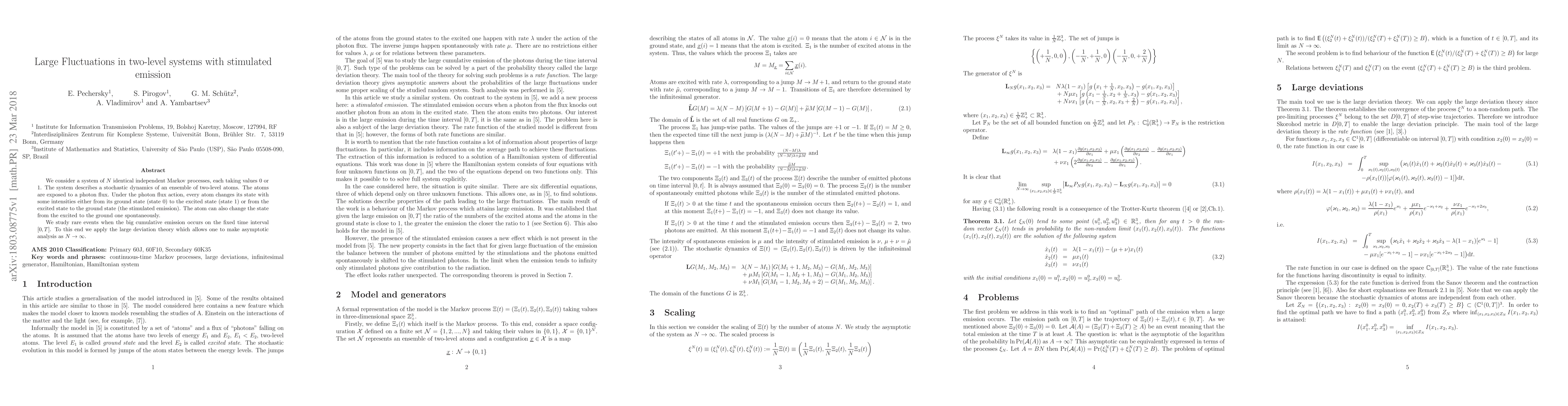 We consider a system of $N$ identical independent Markov processes, each taking values 0 or 1. The system describes a stochastic dynamics of an ensemble of two-level atoms. The atoms are exposed to a photon flux. Under the photon flux action, every atom changes its state with some intensities either from its ground state (state 0) to the excited state (state 1) or from the excited state to the ground state (the stimulated emission). The atom can also change the state from the excited to the ground one spontaneously. We study rare events when the big cumulative emission occurs on the fixed time interval $[0,T]$. To this end we apply the large deviation theory which allows one to make asymptotic analysis as $N\to\infty$.