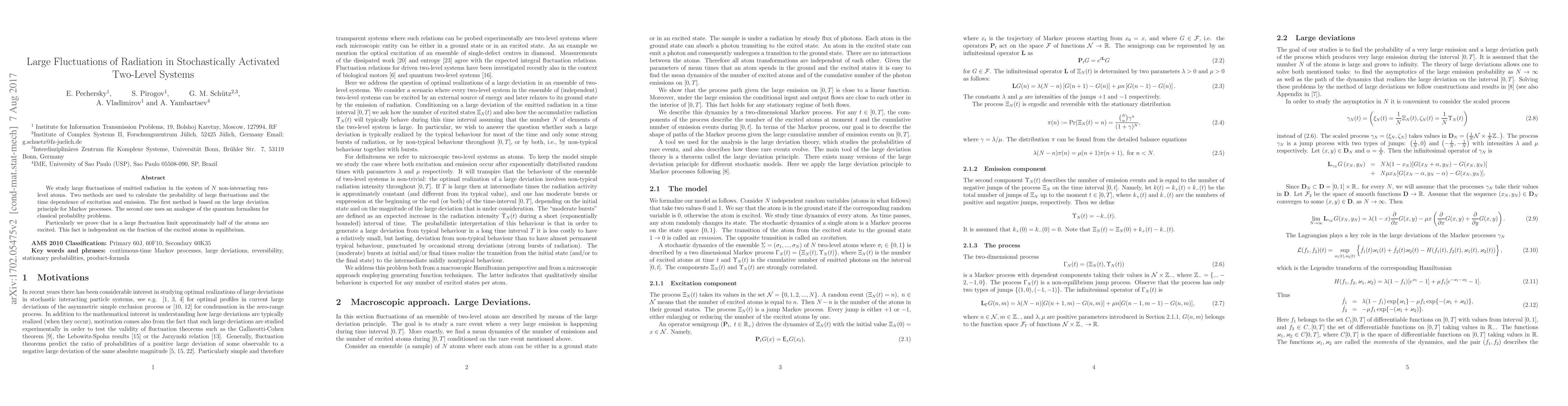This paper investigates large fluctuations in radiation emitted by $N$ non-interacting two-level atoms using two methods: the large deviation principle for Markov processes and a classical analogue of quantum formalism. It finds that in the large fluctuation limit, roughly half of the atoms are excited, regardless of the stationary state fraction of excited atoms.