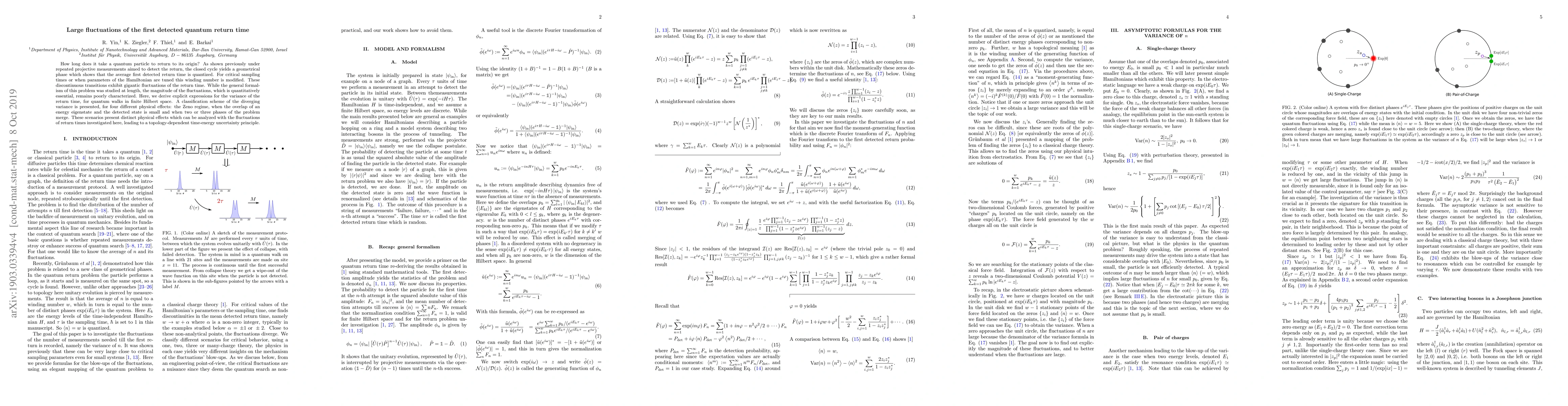 How long does it take a quantum particle to return to its origin? As shown previously under repeated projective measurements aimed to detect the return, the closed cycle yields a geometrical phase which shows that the average first detected return time is quantized. For critical sampling times or when parameters of the Hamiltonian are tuned this winding number is modified. These discontinuous transitions exhibit gigantic fluctuations of the return time. While the general formalism of this problem was studied at length, the magnitude of the fluctuations, which is quantitatively essential, remains poorly characterized. Here, we derive explicit expressions for the variance of the return time, for quantum walks in finite Hilbert space. A classification scheme of the diverging variance is presented, for four different physical effects: the Zeno regime, when the overlap of an energy eigenstate and the detected state is small and when two or three phases of the problem merge. These scenarios present distinct physical effects which can be analyzed with the fluctuations of return times investigated here, leading to a topology-dependent time-energy uncertainty principle.